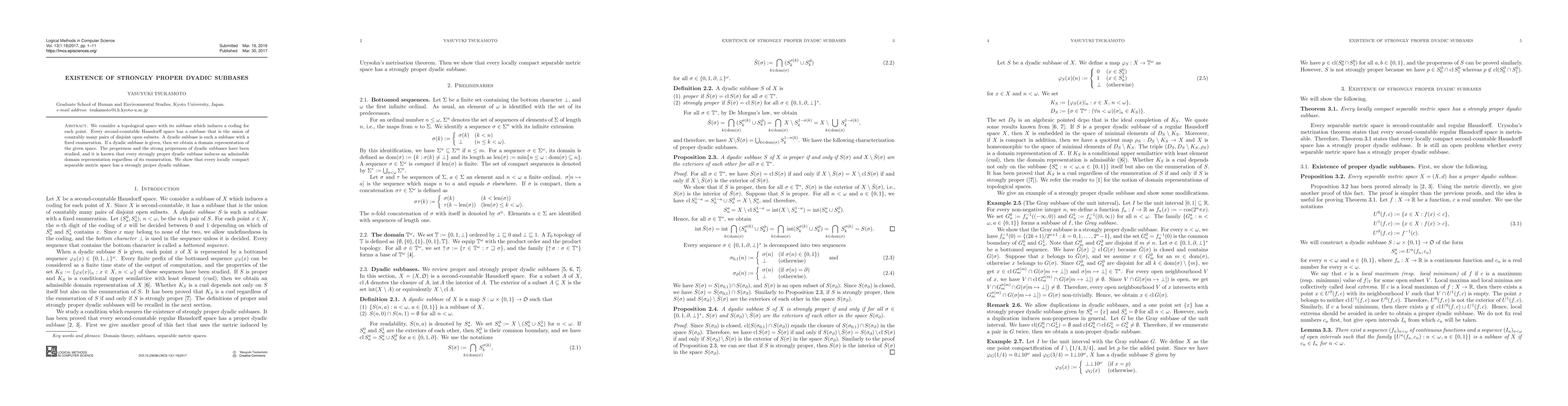 We consider a topological space with its subbase which induces a coding for each point. Every second-countable Hausdorff space has a subbase that is the union of countably many pairs of disjoint open subsets. A dyadic subbase is such a subbase with a fixed enumeration. If a dyadic subbase is given, then we obtain a domain representation of the given space. The properness and the strong properness of dyadic subbases have been studied, and it is known that every strongly proper dyadic subbase induces an admissible domain representation regardless of its enumeration. We show that every locally compact separable metric space has a strongly proper dyadic subbase.