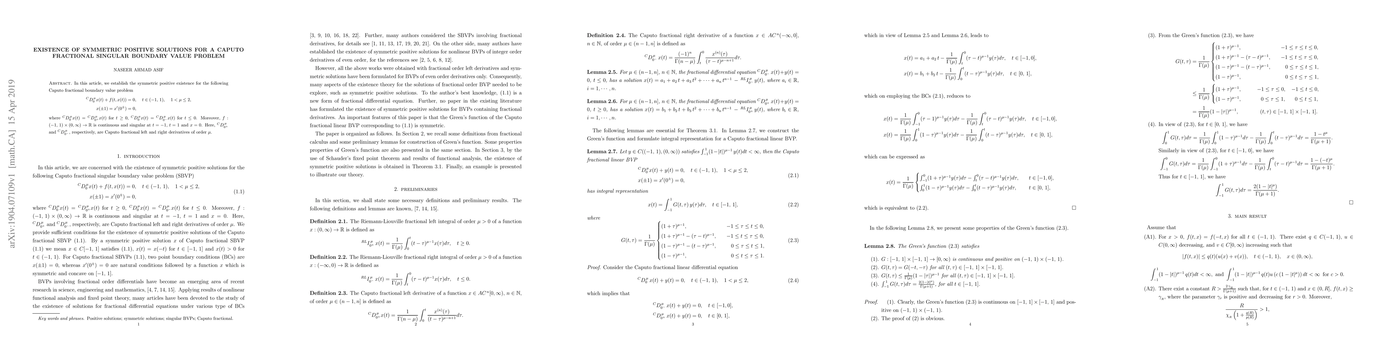 The paper establishes symmetric positive existence for a Caputo fractional singular boundary value problem using fixed-point theorems and properties of Green's function.