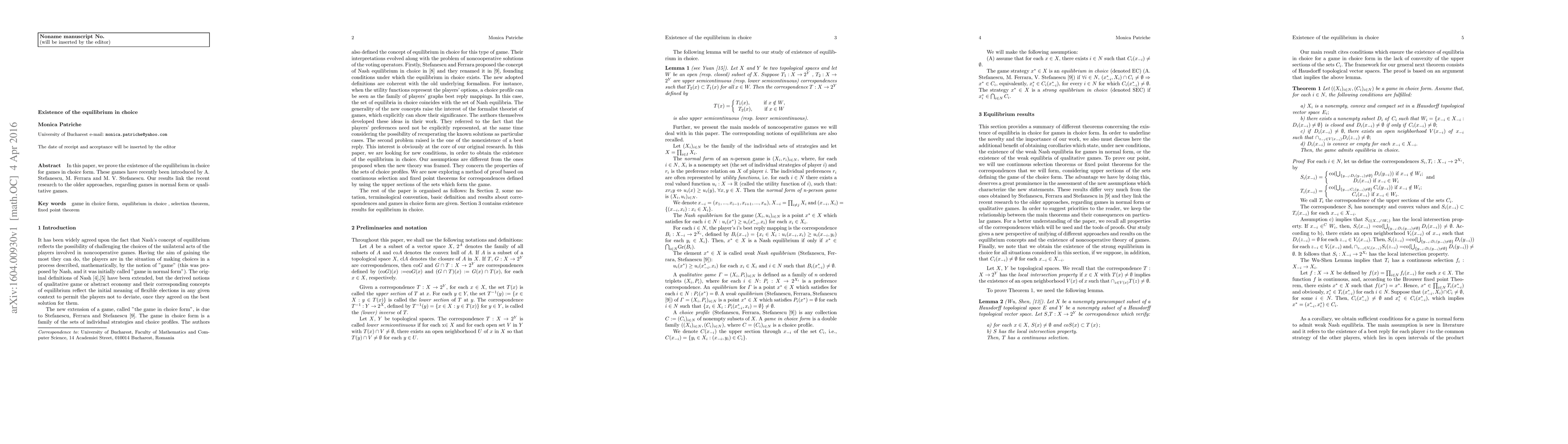 In this paper, we prove the existence of the equilibrium in choice for games in choice form. These games have recently been introduced by A. Stefanescu, M. Ferrara and M. V. Stefanescu. Our results link the recent research to the older approaches, regarding games in normal form or qualitative games.