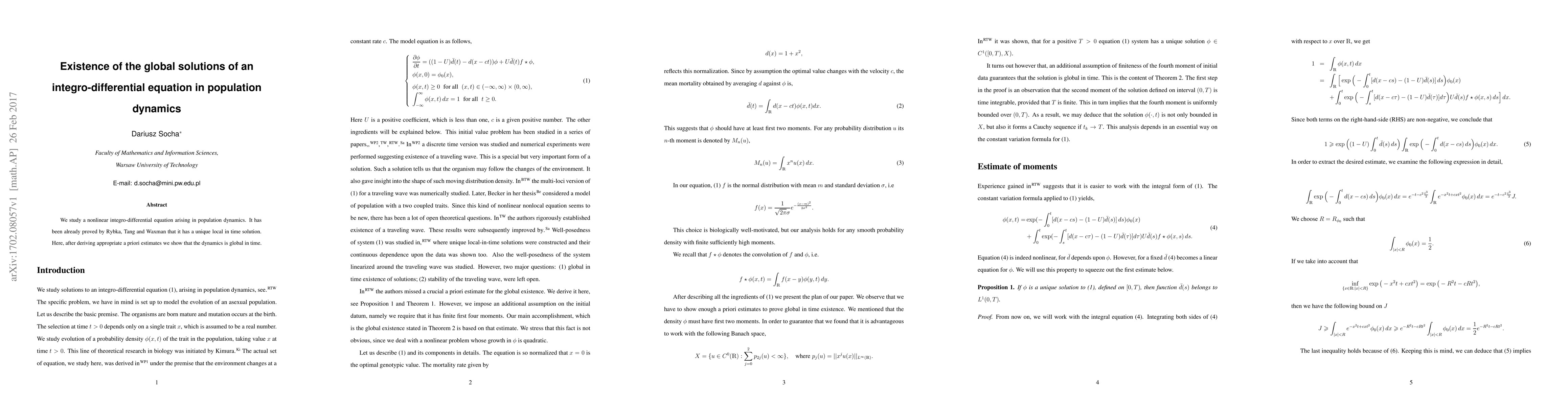 We study a nonlinear integro-differential equation arising in population dynamics. It has been already proved by Rybka, Tang and Waxman that it has a unique local in time solution. Here, after deriving appropriate a priori estimates we show that the dynamics is global in time.