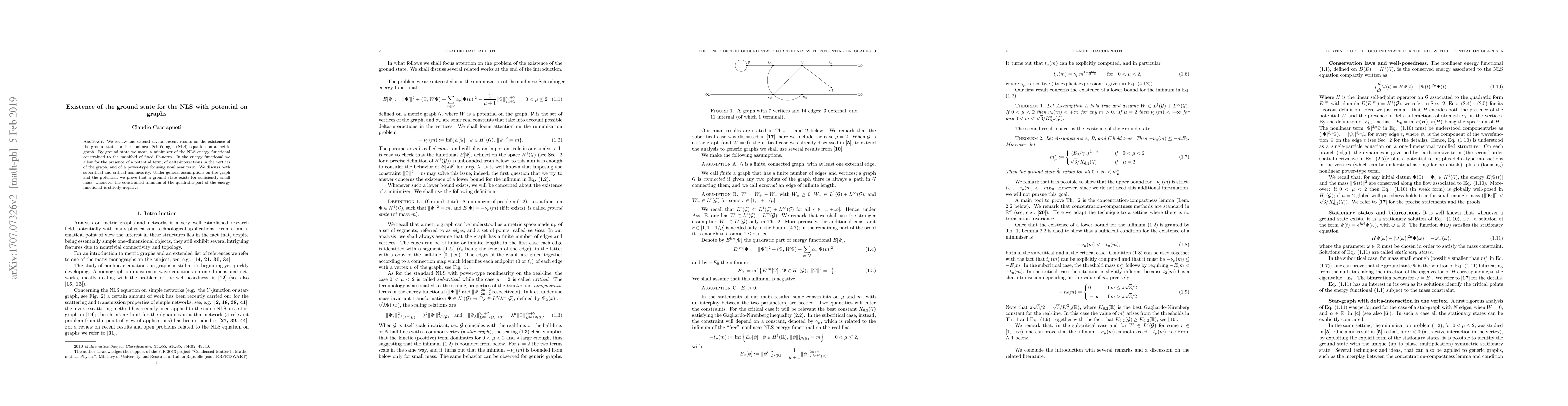 This paper reviews and extends results on the existence of ground states for the nonlinear Schrödinger (NLS) equation on metric graphs, considering potentials, delta-interactions, and focusing nonlinear terms. It proves the existence of ground states for small mass under general assumptions, provided the quadratic part of the energy functional's constrained infimum is negative.