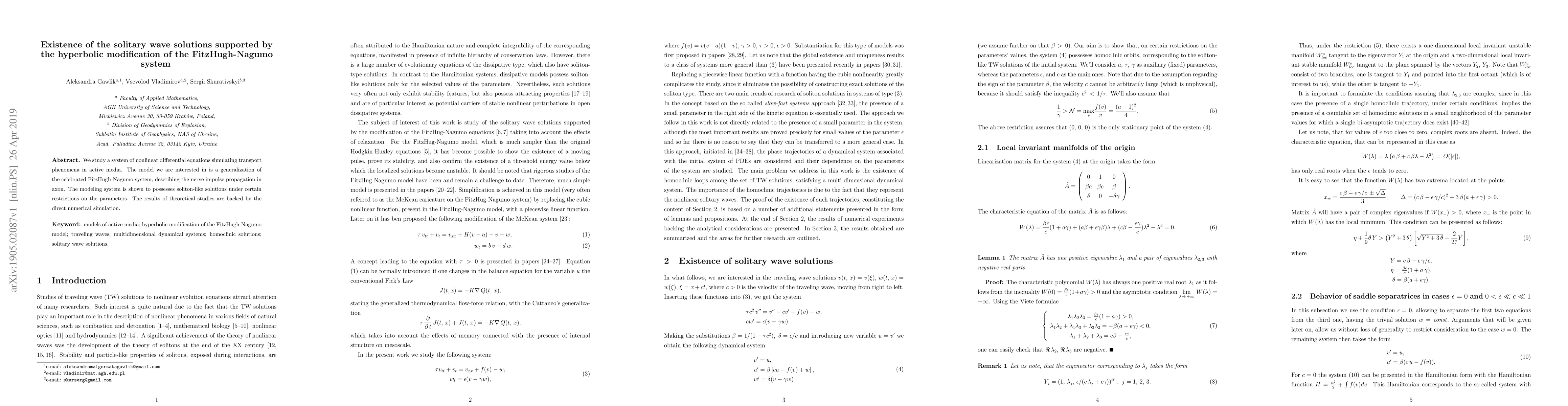 We study a system of nonlinear differential equations simulating transport phenomena in active media. The model we are interested in is a generalization of the celebrated FitzHugh-Nagumo system, describing the nerve impulse propagation in axon. The modeling system is shown to possesses soliton-like solutions under certain restrictions on the parameters. The results of theoretical studies are backed by the direct numerical simulation.