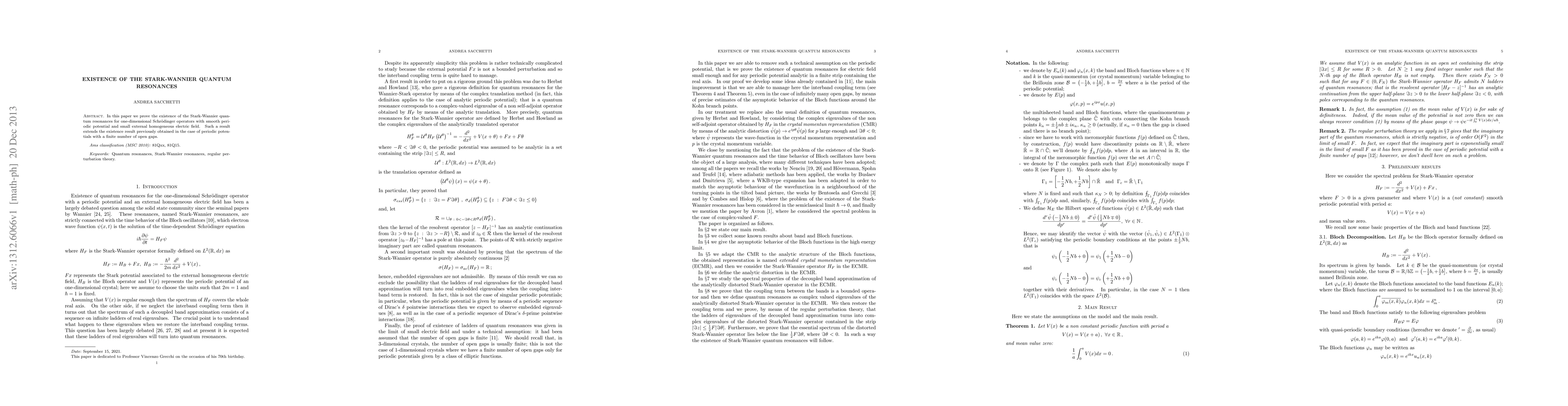 This paper proves the existence of Stark-Wannier quantum resonances for one-dimensional Schrödinger operators with smooth periodic potentials under a small external electric field, extending previous results to potentials with an infinite number of open gaps.