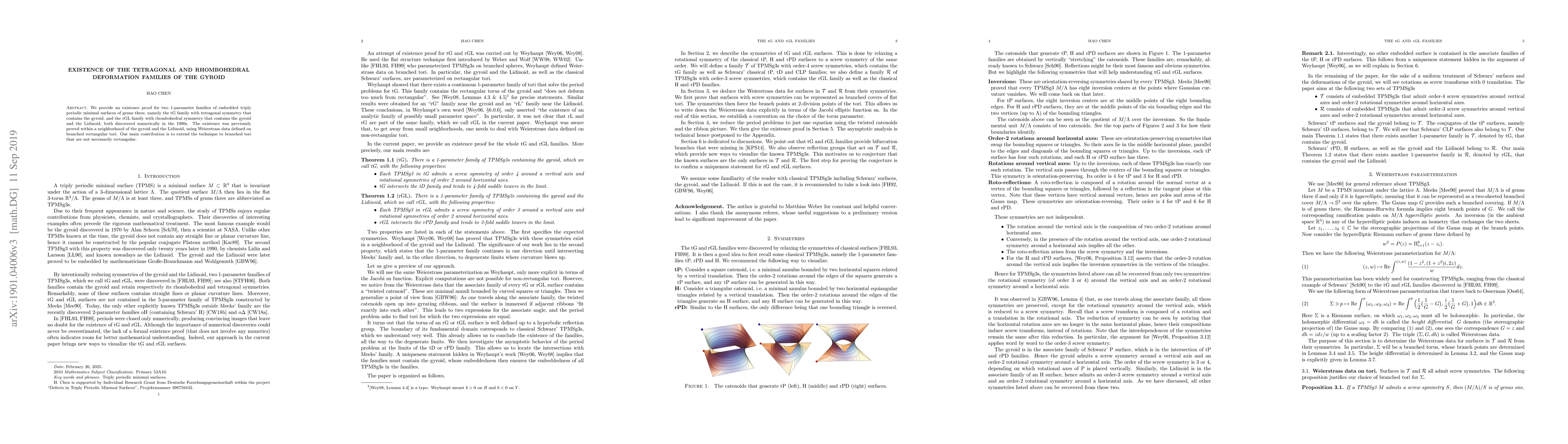 We provide an existence proof for two 1-parameter families of embedded triply periodic minimal surfaces of genus three, namely the tG family with tetragonal symmetry that contains the gyroid, and the rGL family with rhombohedral symmetry that contains the gyroid and the Lidinoid, both discovered numerically in the 1990s. The existence was previously proved within a neighborhood of the gyroid and the Lidinoid, using Weierstrass data defined on branched rectangular tori. Our main contribution is to extend the technique to branched tori that are not necessarily rectangular.