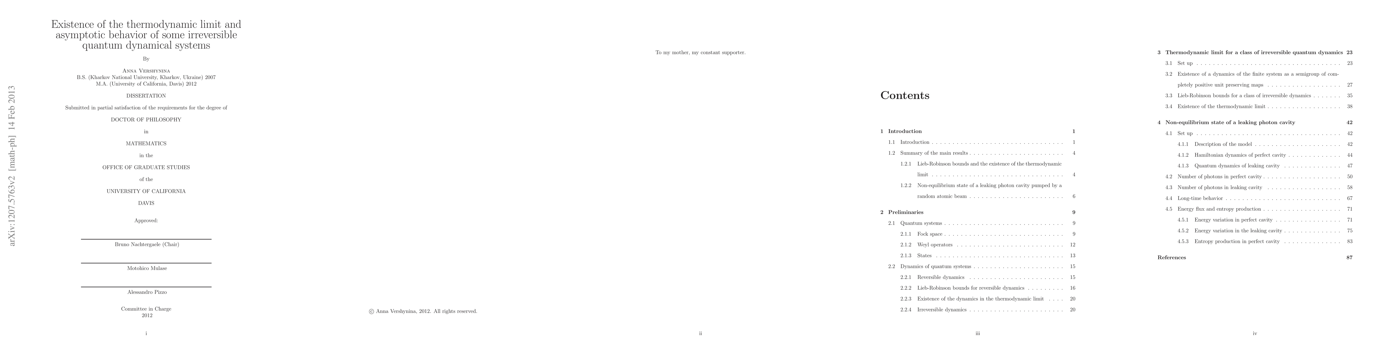 This paper investigates the thermodynamic limit and asymptotic behavior of irreversible quantum dynamical systems. It establishes the existence of Lieb-Robinson bounds in finite quantum lattice systems and proves the existence of the thermodynamic limit for such dynamics. It also examines a beam of two-level atoms passing through a microwave cavity, showing that photon number increases indefinitely in an ideal cavity but stabilizes in a leaky cavity, with a well-defined limiting state.