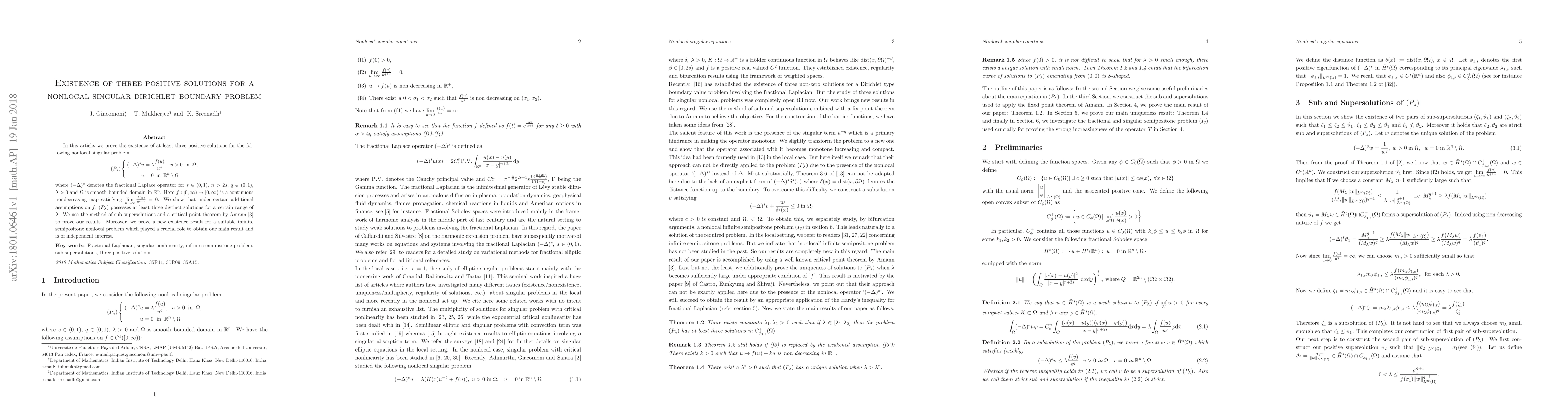 This paper proves the existence of at least three positive solutions for a nonlocal singular Dirichlet boundary problem, using a combination of sub-supersolutions and critical point theorems.