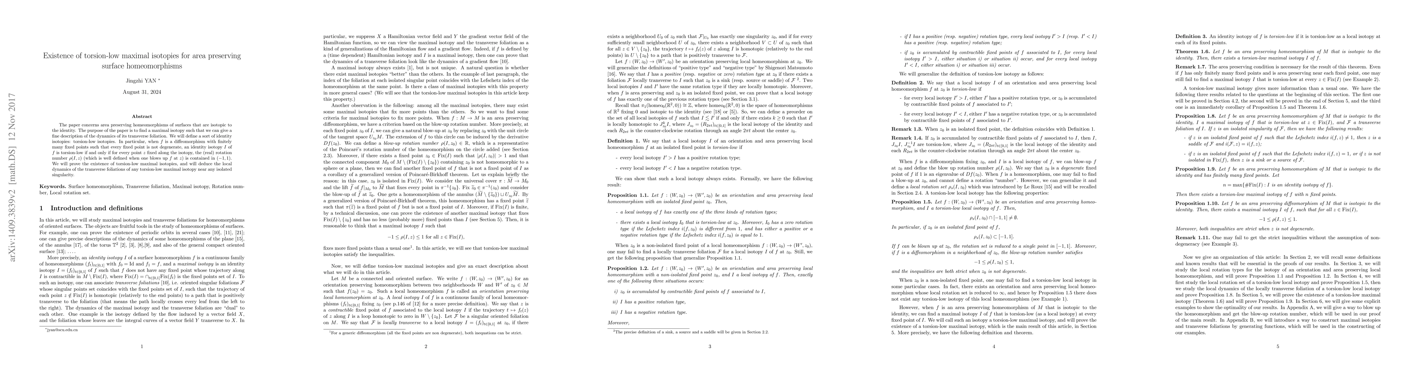 The paper investigates area-preserving homeomorphisms isotopic to the identity, aiming to identify and describe torsion-low maximal identity isotopies. It proves the existence of these isotopies and analyzes their local dynamics near isolated singularities.