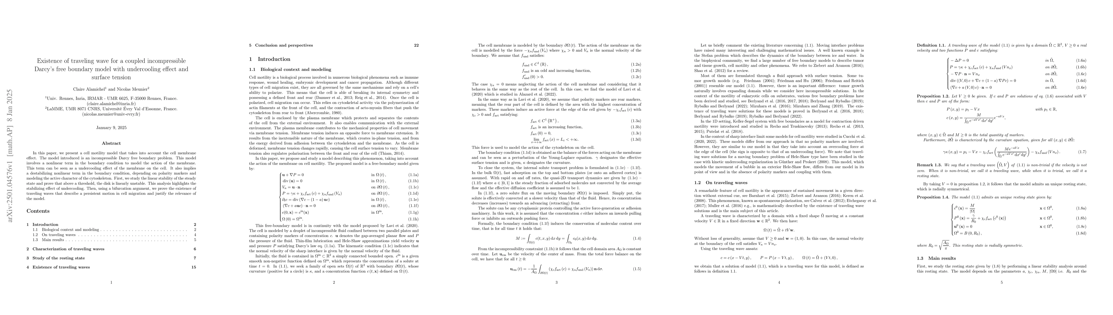 In this paper, we present a cell motility model that takes into account the cell membrane effect. The model introduced is an incompressible Darcy free boundary problem. This model involves a nonlinear term in the boundary condition to model the action of the membrane. This term can be seen as a undercooling effect of the membrane on the cell. It also implies a destabilizing nonlinear term in the boundary condition, depending on polarity markers and modeling the active character of the cytoskeleton. First, we study the linear stability of the steady state and prove that above a threshold, the disk is linearly unstable. This analysis highlights the stabilizing effect of undercooling. Then, using a bifurcation argument, we prove the existence of traveling waves that describe a persistent motion in cell migration and justify the relevance of the model.