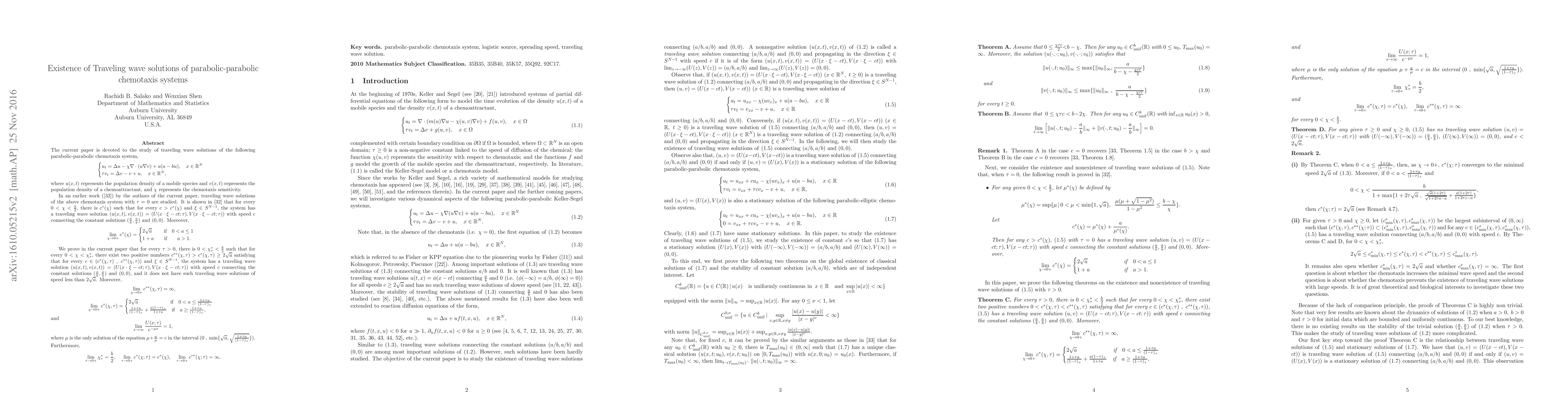 This paper investigates traveling wave solutions for a parabolic-parabolic chemotaxis system, proving the existence of such solutions for certain chemotaxis sensitivity and chemoattractant diffusion parameters. It establishes a critical wave speed threshold and provides detailed asymptotic behavior for the wave profiles as chemotaxis sensitivity approaches zero.