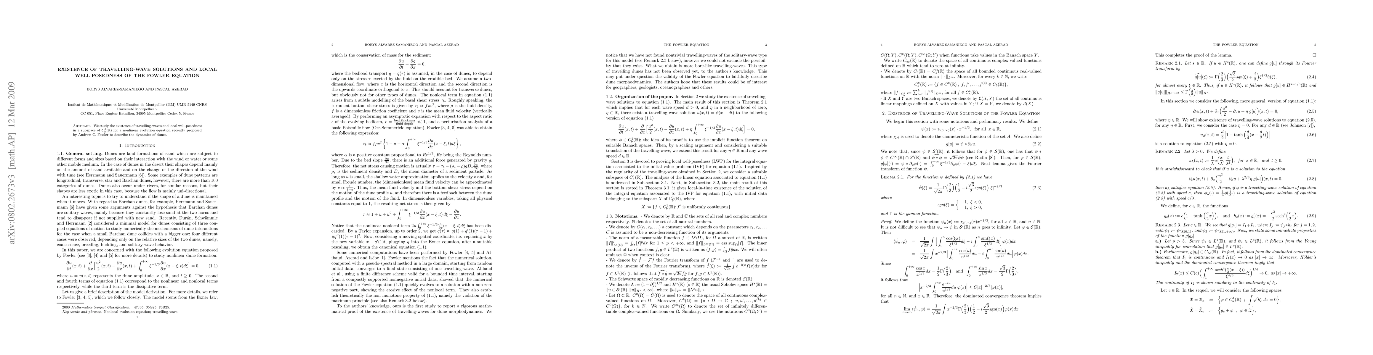 Researchers study a nonlinear evolution equation to understand dune dynamics and find traveling-wave solutions, demonstrating local well-posedness in a specific subspace of functions.