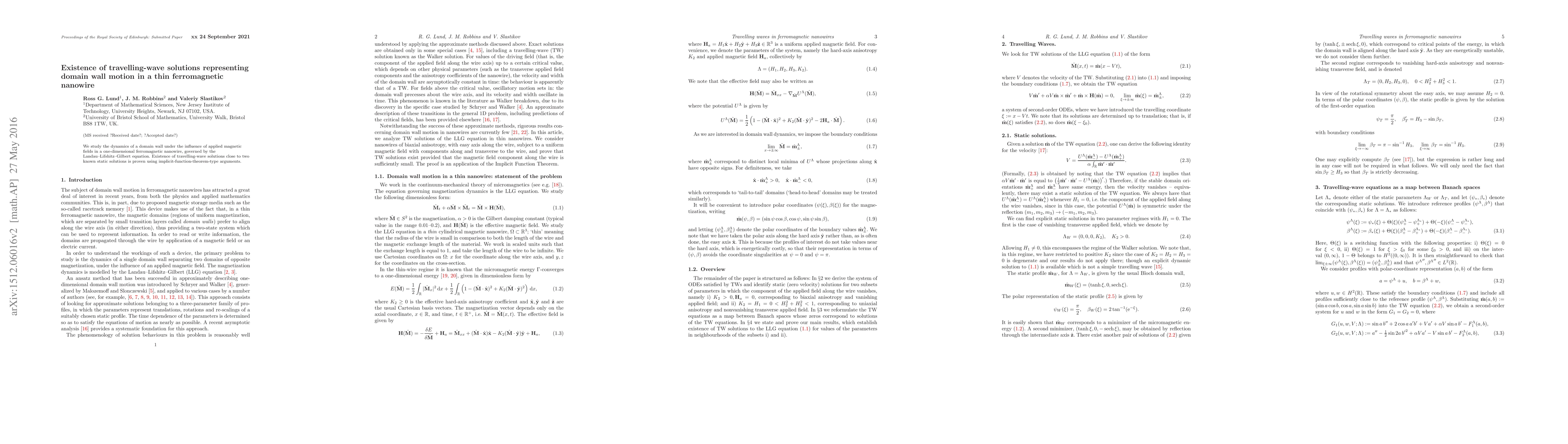 This paper investigates the dynamics of a domain wall in a one-dimensional ferromagnetic nanowire under applied magnetic fields, proving the existence of travelling-wave solutions using implicit-function-theorem-type arguments near two known static solutions.