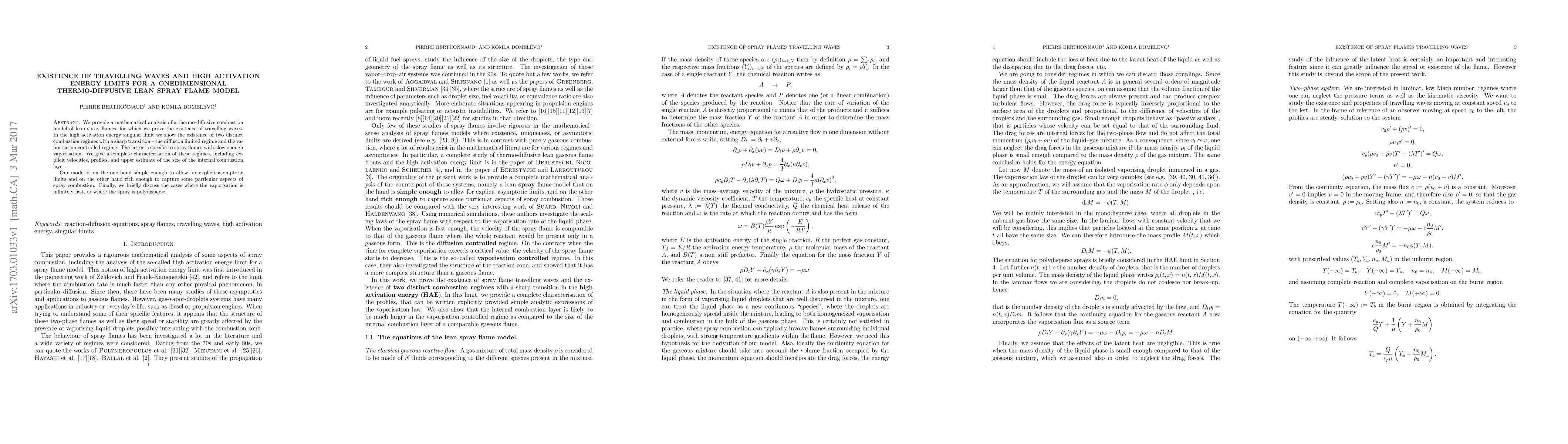 This paper mathematically analyzes a thermo-diffusive model for lean spray flames, proving the existence of travelling waves and identifying two combustion regimes in high activation energy limits: a diffusion-limited regime and a vaporization-controlled regime. It provides explicit characteristics for these regimes and discusses scenarios with rapid vaporization or polydisperse sprays.