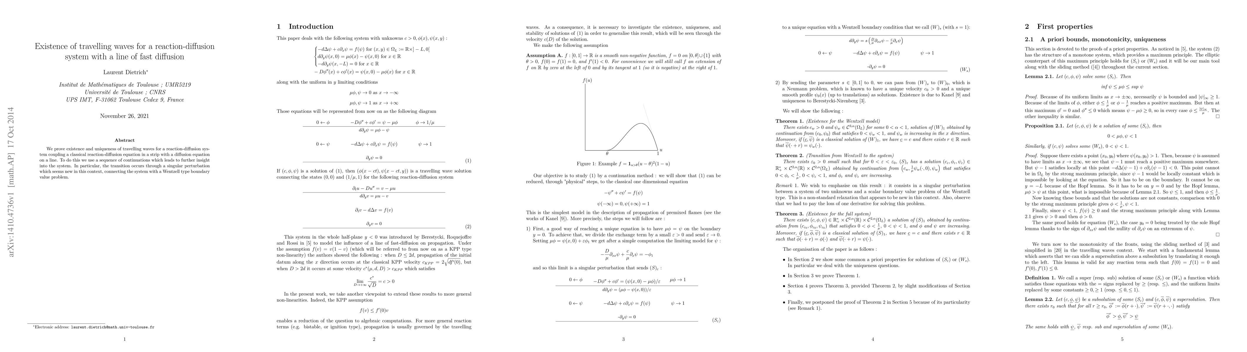 This paper proves the existence and uniqueness of travelling waves for a reaction-diffusion system featuring a strip with classical reaction-diffusion and a line with fast diffusion. The continuation method used reveals a novel singular perturbation transition, linking the system to a Wentzell type boundary value problem.