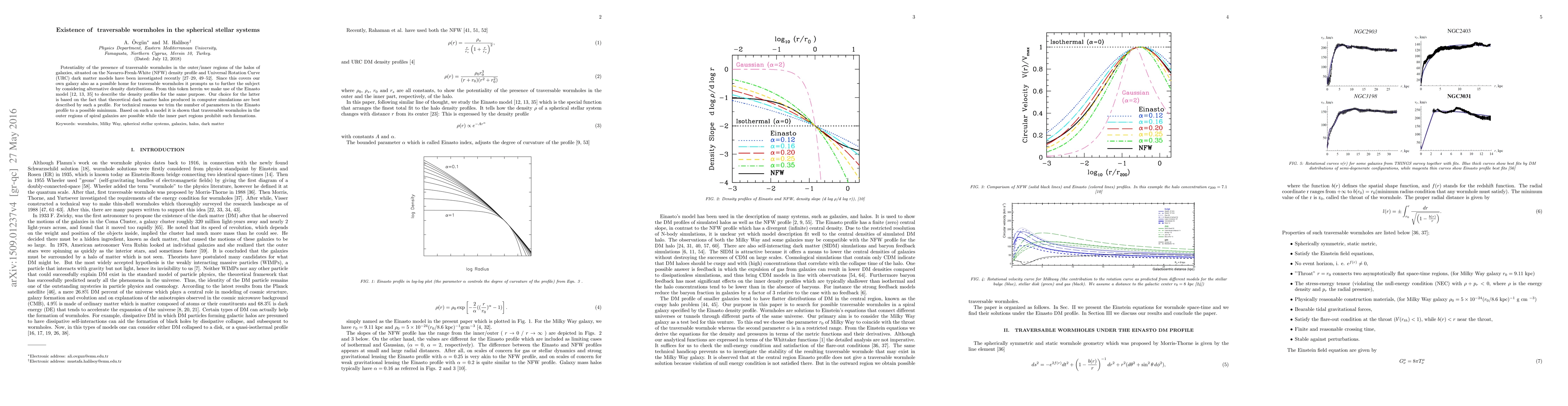 Potentiality of the presence of traversable wormholes in the outer/inner regions of the halos of galaxies, situated on the Navarro-Frenk-White (NFW) density profile and Universal Rotation Curve (URC) dark matter models have been investigated recently. Since this covers our own galaxy also as a possible home for traversable wormholes it prompts us to further the subject by considering alternative density distributions. From this token herein we make use of the Einasto model to describe the density profiles for the same purpose. Our choice for the latter is based on the fact that theoretical dark matter halos produced in computer simulations are best described by such a profile. For technical reasons we trim the number of parameters in the Einasto profile to a possible minimum. Based on such a model it is shown that traversable wormholes in the outer regions of spiral galaxies are possible while the inner part regions prohibit such formations.