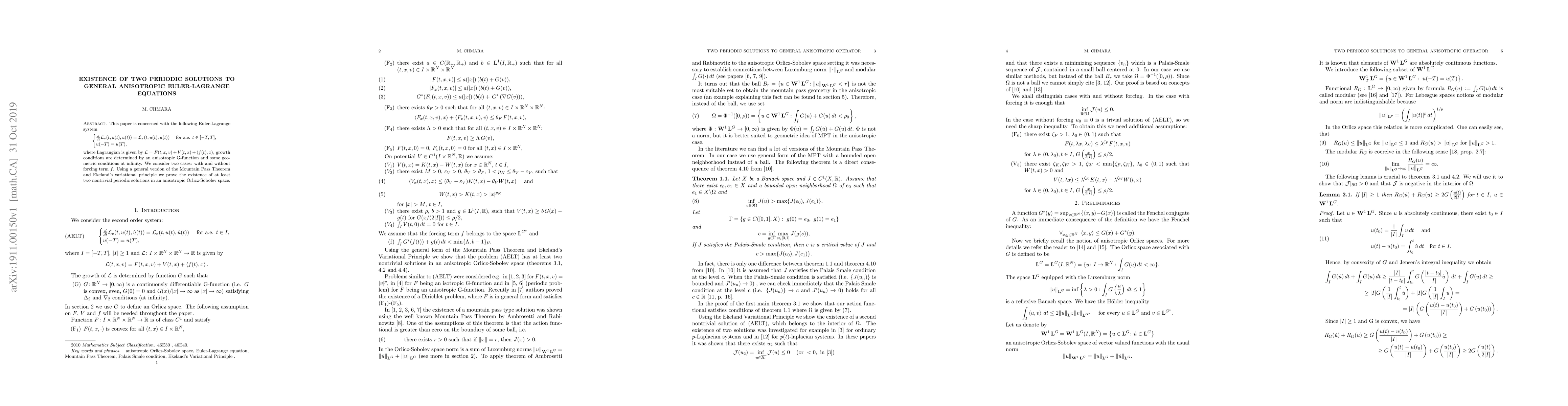 This paper proves the existence of at least two periodic solutions for a general anisotropic Euler-Lagrange system using variational methods, including the Mountain Pass Theorem and Ekeland's principle, under specified growth and geometric conditions.