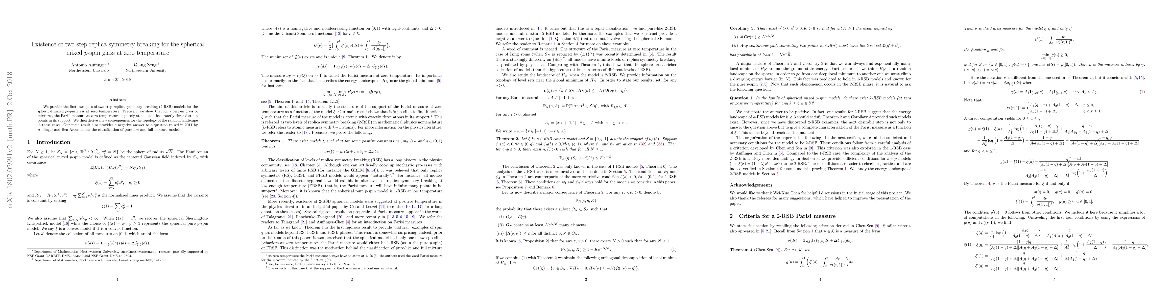 This paper presents the first two-step replica symmetry breaking (2-RSB) models for the spherical mixed p-spin glass at zero temperature, demonstrating that the Parisi measure has exactly three distinct points in its support for certain mixtures. It also addresses a 2011 question by Auffinger and Ben Arous, providing a negative classification for pure-like and full mixture models.