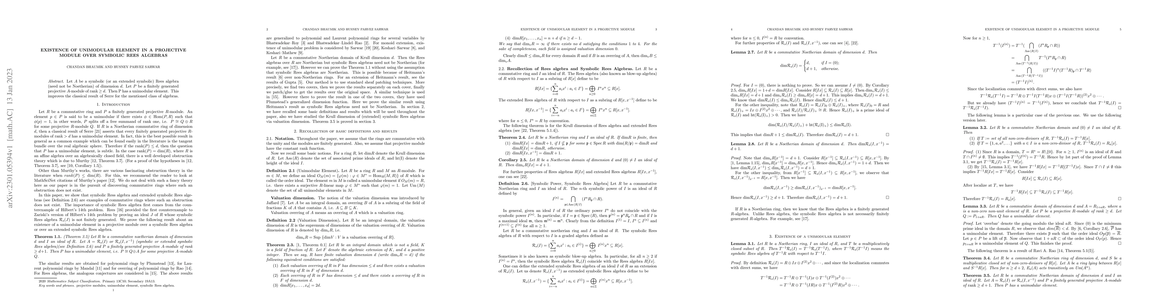 Let $A$ be a symbolic (or an extended symbolic) Rees algebra (need not be Noetherian) of dimension $d$. Let $P$ be a finitely generated projective $A$-module of rank $\geq$ $d$. Then P has a unimodular element. This improves the classical result of Serre for the mentioned class of algebras.