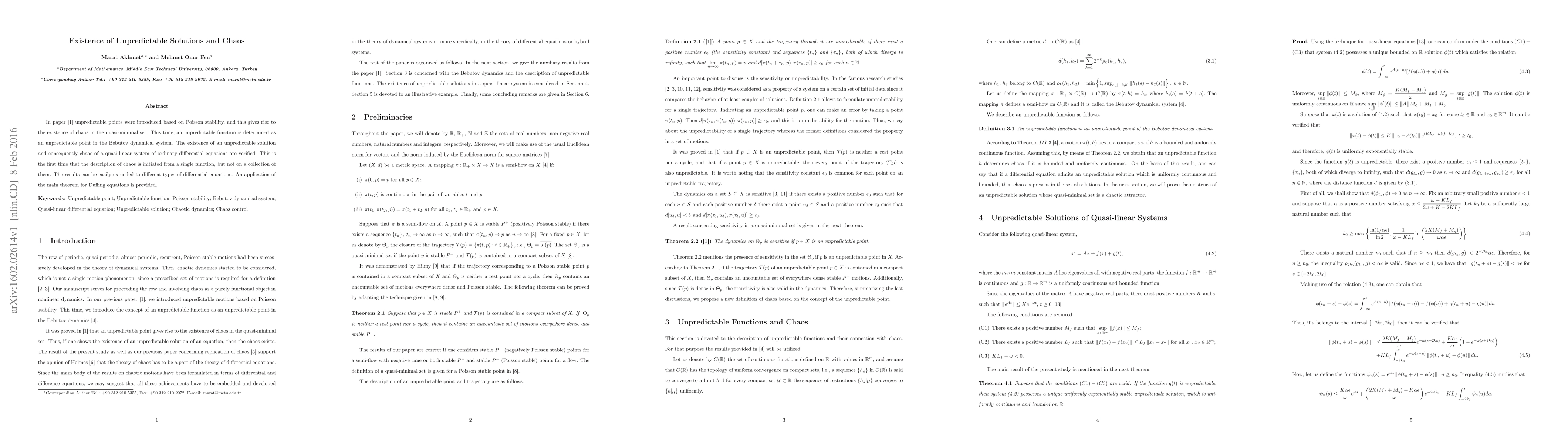 In paper [1] unpredictable points were introduced based on Poisson stability, and this gives rise to the existence of chaos in the quasi-minimal set. This time, an unpredictable function is determined as an unpredictable point in the Bebutov dynamical system. The existence of an unpredictable solution and consequently chaos of a quasi-linear system of ordinary differential equations are verified. This is the first time that the description of chaos is initiated from a single function, but not on a collection of them. The results can be easily extended to different types of differential equations. An application of the main theorem for Duffing equations is provided.