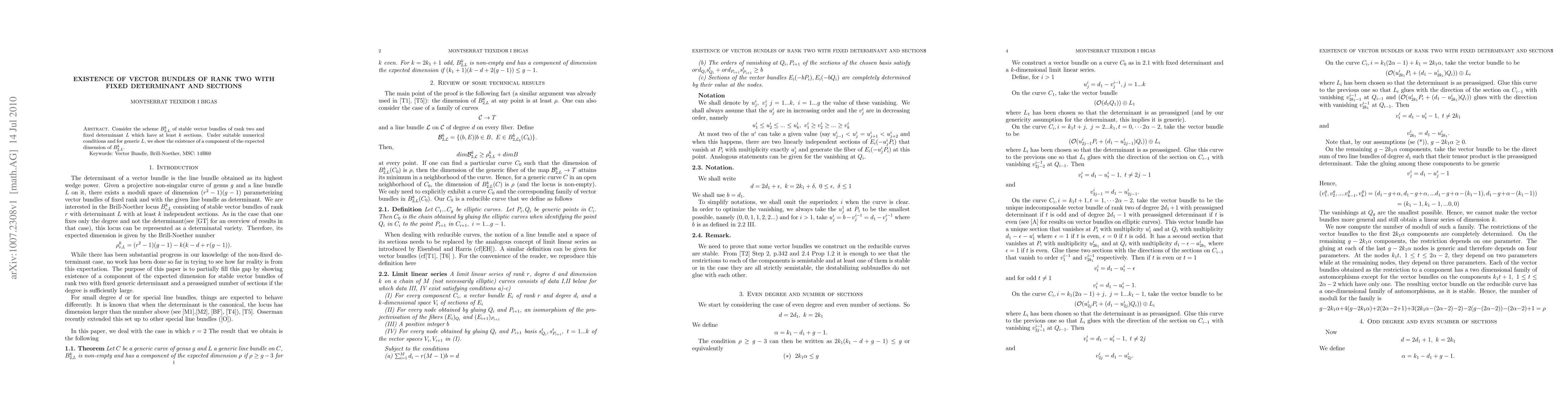 Consider the scheme B_{2,L}^k of stable vector bundles of rank two and fixed determinant L which have at least k sections. Under suitable numerical conditions and for generic L, we show the existence of a component of the expected dimension of B_{2,L}^k.