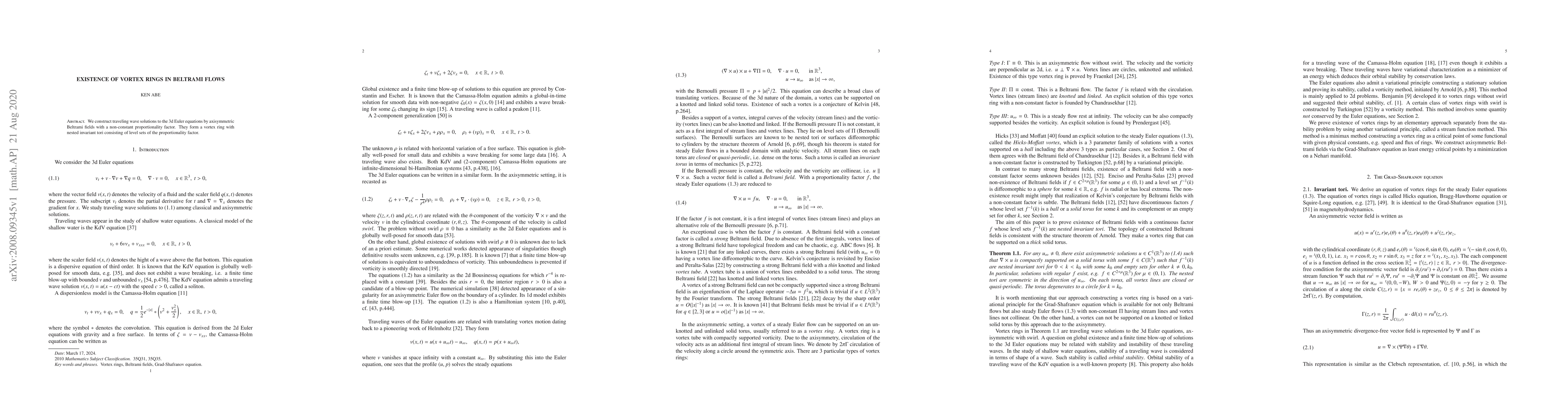 Summary: The paper constructs traveling wave solutions to the 3D Euler equations using axisymmetric Beltrami fields, revealing the formation of vortex rings with nested invariant tori defined by the proportionality factor. This provides insight into the dynamics of Beltrami flows.