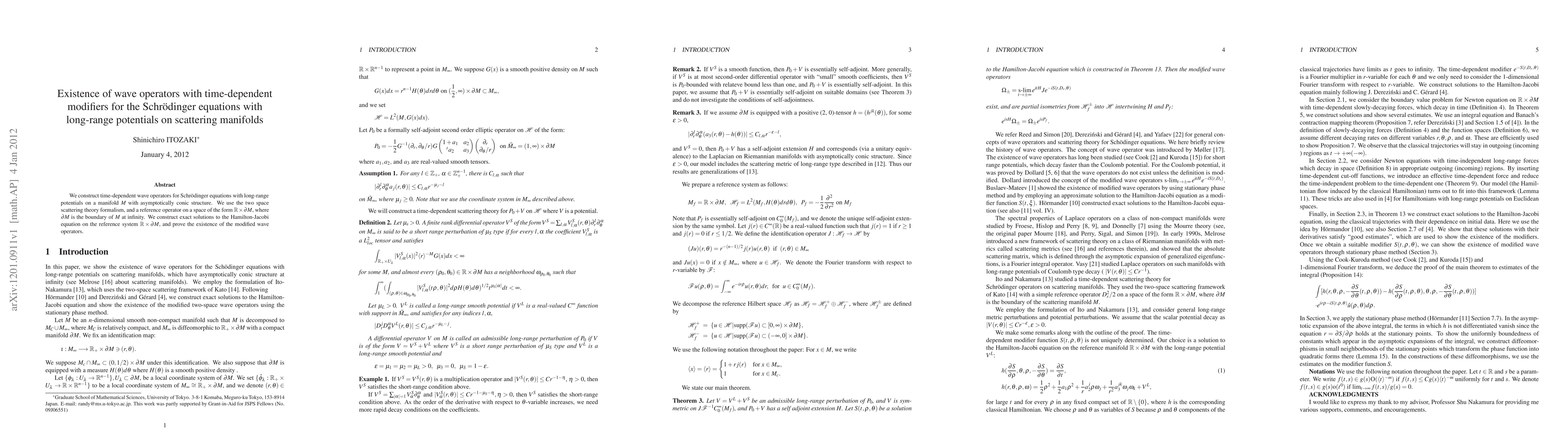 We construct time-dependent wave operators for Schr\"{o}dinger equations with long-range potentials on a manifold $M$ with asymptotically conic structure. We use the two space scattering theory formalism, and a reference operator on a space of the form $\mathbb{R} \times \partial M$, where $\partial M$ is the boundary of $M$ at infinity. We construct exact solutions to the Hamilton-Jacobi equation on the reference system $\mathbb{R} \times \partial M$, and prove the existence of the modified wave operators.