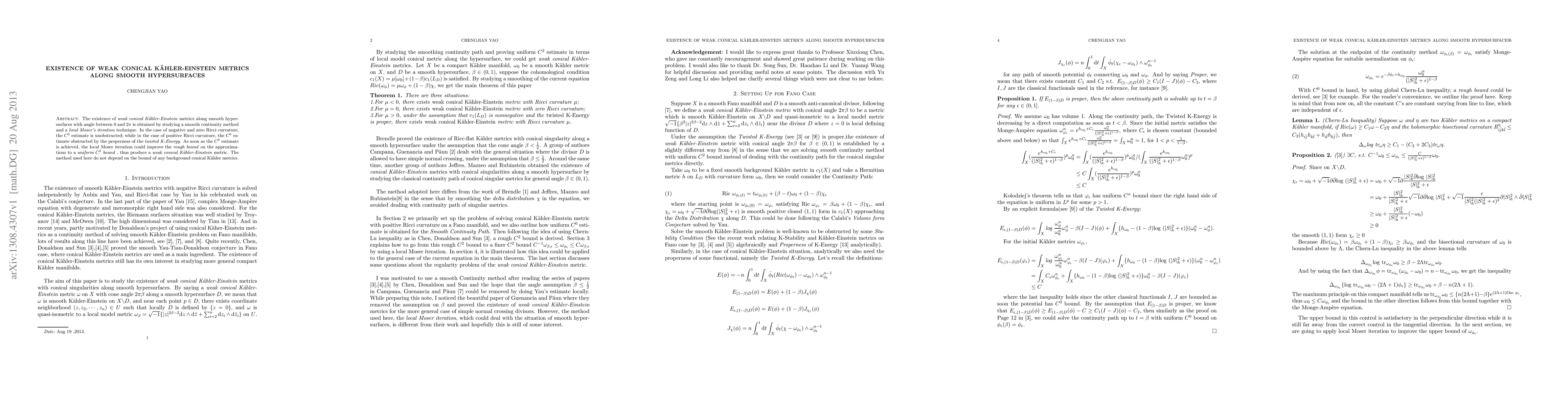 The existence of \emph{weak conical K\"ahler-Einstein} metrics along smooth hypersurfaces with angle between $0$ and $2\pi$ is obtained by studying a smooth continuity method and a \emph{local Moser's iteration} technique. In the case of negative and zero Ricci curvature, the $C^0$ estimate is unobstructed; while in the case of positive Ricci curvature, the $C^0$ estimate obstructed by the properness of the \emph{twisted K-Energy}. As soon as the $C^0$ estimate is achieved, the local Moser iteration could improve the \emph{rough bound} on the approximations to a \emph{uniform $C^2$ bound}, thus produce a \emph{weak conical K\"ahler-Einstein} metric. The method used here do not depend on the bound of any background conical K\"ahler metrics.