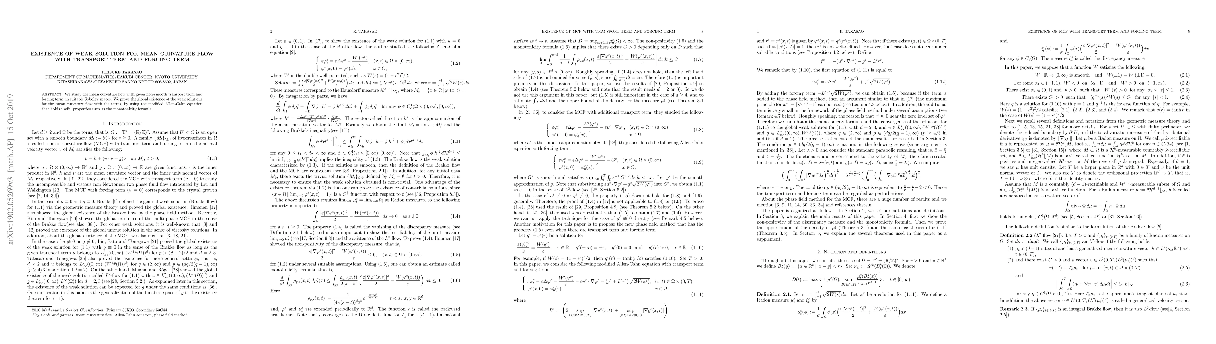 This paper investigates the mean curvature flow incorporating non-smooth transport and forcing terms within Sobolev spaces, proving the global existence of weak solutions via a modified Allen-Cahn equation, leveraging properties like the monotonicity formula.