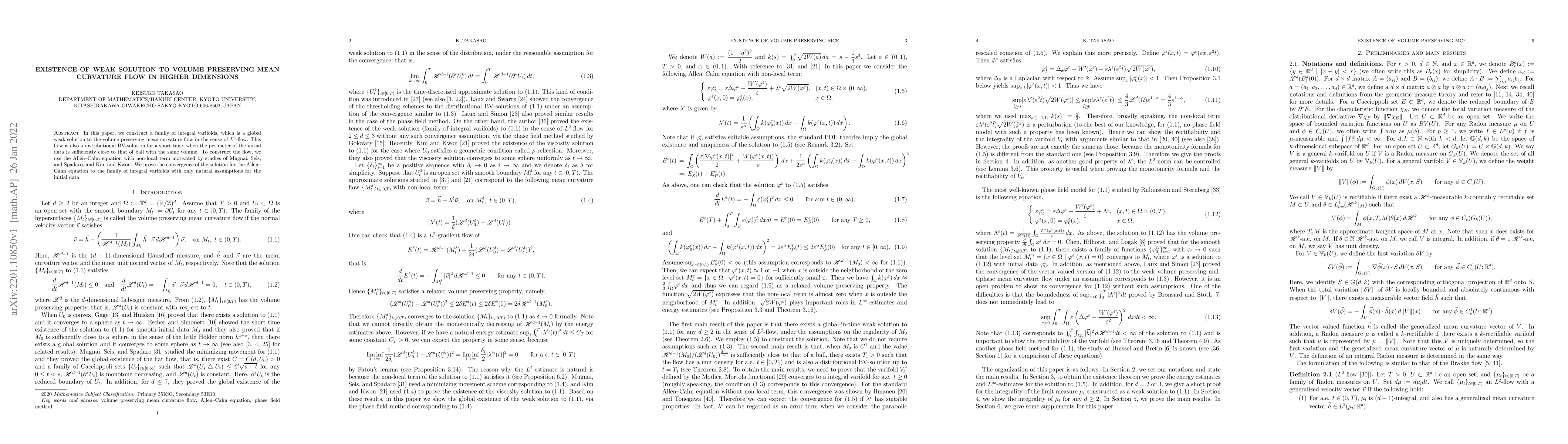 This paper constructs a global weak solution to volume preserving mean curvature flow in higher dimensions using a family of integral varifolds and the Allen-Cahn equation with a non-local term. The solution is shown to converge under natural initial data conditions.