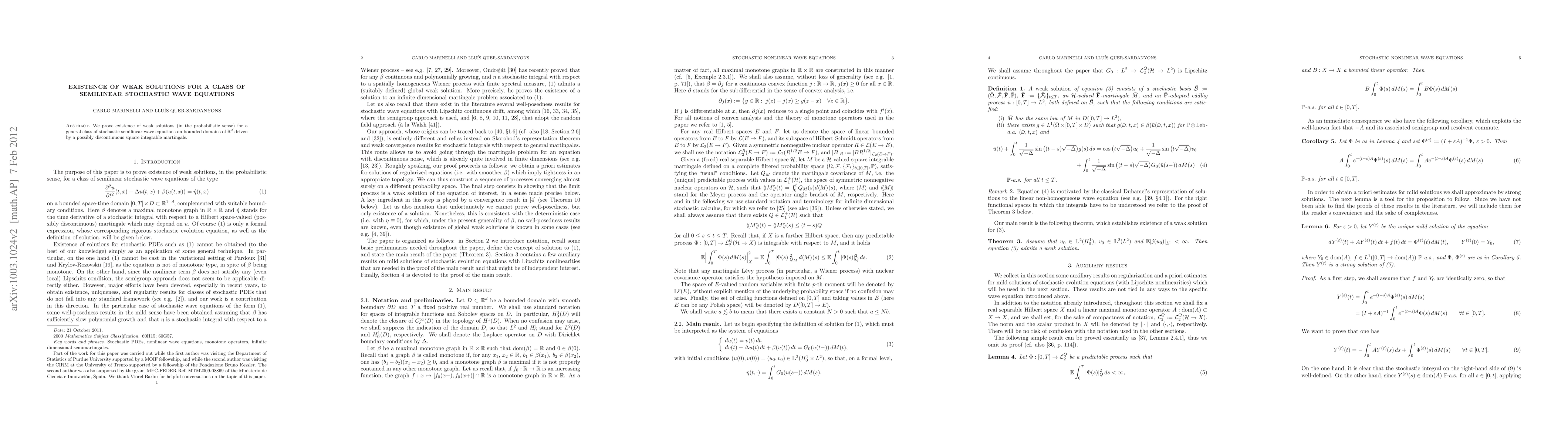 Summary: This paper establishes the existence of weak solutions for a broad class of stochastic semilinear wave equations on bounded domains in $R^d$, driven by a discontinuous square integrable martingale, using probabilistic methods. The results extend the applicability of weak solution theory to more complex stochastic dynamics.