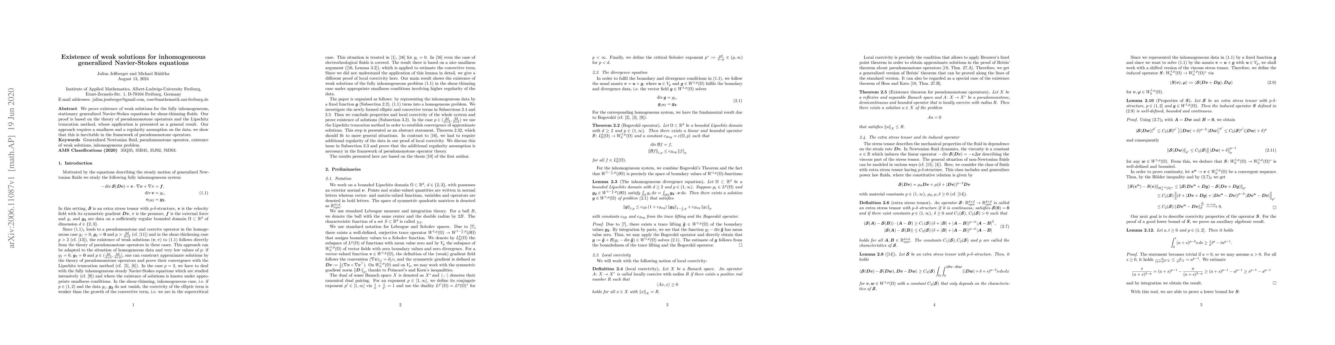 This paper proves the existence of weak solutions for the stationary generalized Navier-Stokes equations governing shear-thinning fluids, utilizing pseudomonotone operators and the Lipschitz truncation method. The authors argue that smallness and regularity assumptions on input data are necessary and inherent in this theoretical framework.