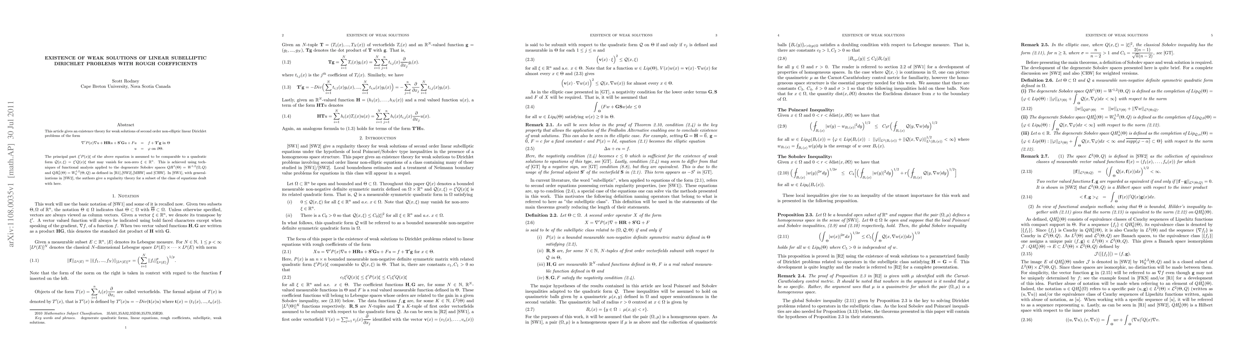 This article gives an existence theory for weak solutions of second order non-elliptic linear Dirichlet problems of the form {eqnarray} \nabla'P(x)\nabla u +{\bf HR}u+{\bf S'G}u +Fu &=& f+{\bf T'g} \textrm{in}\Theta u&=&\phi\textrm{on}\partial \Theta.{eqnarray} The principal part $\xi'P(x)\xi$ of the above equation is assumed to be comparable to a quadratic form ${\cal Q}(x,\xi) = \xi'Q(x)\xi$ that may vanish for non-zero $\xi\in\mathbb{R}^n$. This is achieved using techniques of functional analysis applied to the degenerate Sobolev spaces $QH^1(\Theta)=W^{1,2}(\Omega,Q)$ and $QH^1_0(\Theta)=W^{1,2}_0(\Theta,Q)$ as defined in recent work of E. Sawyer and R. L. Wheeden. The aforementioned authors in referenced work give a regularity theory for a subset of the class of equations dealt with here.