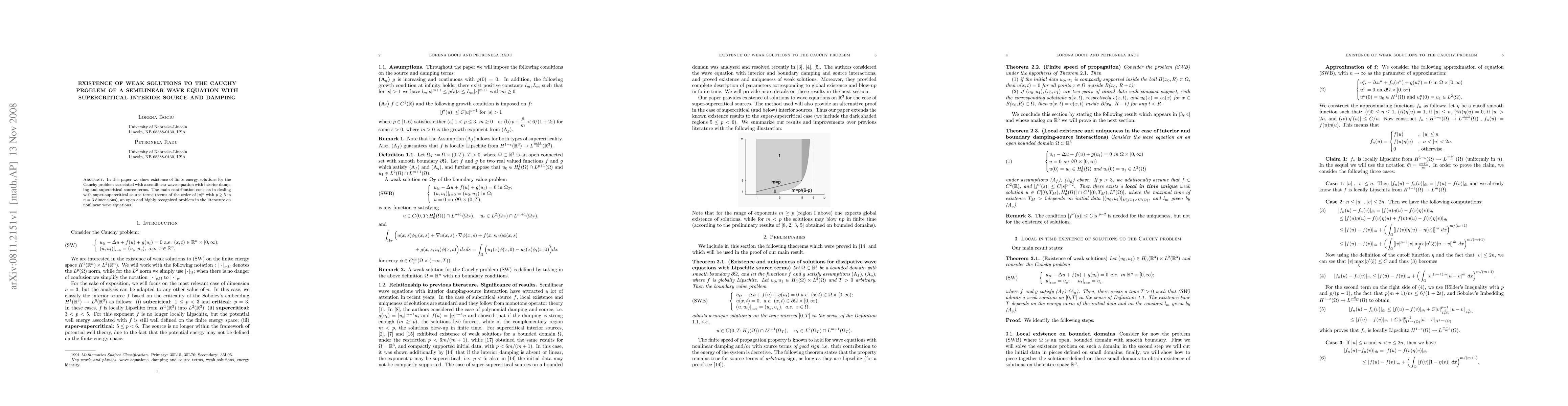 In this paper we show existence of finite energy solutions for the Cauchy problem associated with a semilinear wave equation with interior damping and supercritical source terms. The main contribution consists in dealing with super-supercritical source terms (terms of the order of $|u|^p$ with $p\geq 5$ in $n=3$ dimensions), an open and highly recognized problem in the literature on nonlinear wave equations.
