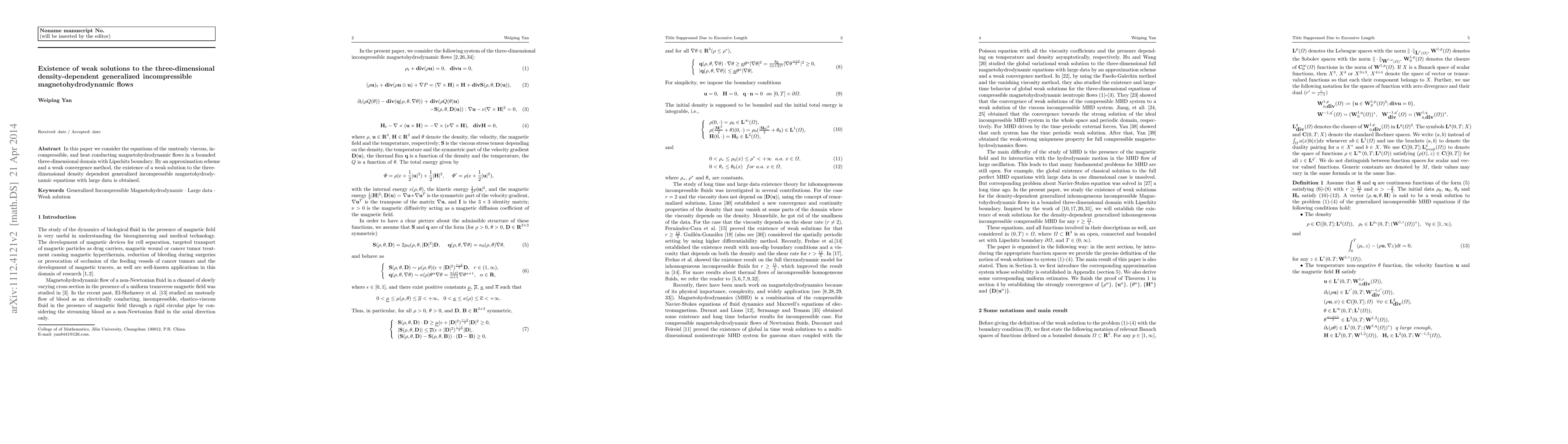 In this paper we consider the equations of the unsteady viscous, incompressible, and heat conducting magnetohydrodynamic flows in a bounded three-dimensional domain with Lipschitz boundary. By an approximation scheme and a weak convergence method, the existence of a weak solution to the three-dimensional density dependent generalized incompressible magnetohydrodynamic equations with large data is obtained.