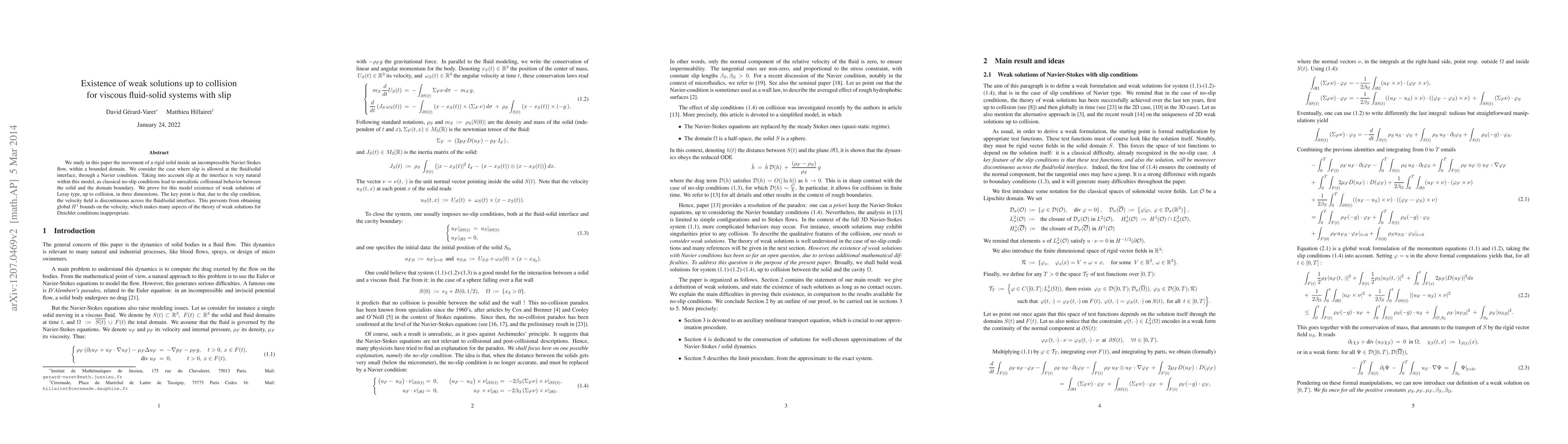 We study in this paper the movement of a rigid solid inside an incompressible Navier-Stokes flow, within a bounded domain. We consider the case where slip is allowed at the fluid/solid interface, through a Navier condition. Taking into account slip at the interface is very natural within this model, as classical no-slip conditions lead to unrealistic collisional behavior between the solid and the domain boundary. We prove for this model existence of weak solutions of Leray type, up to collision, in three dimensions. The key point is that, due to the slip condition, the velocity field is discontinuous across the fluid/solid interface. This prevents from obtaining global H1 bounds on the velocity, which makes many aspects of the theory of weak solutions for Dirichlet conditions unadapted.