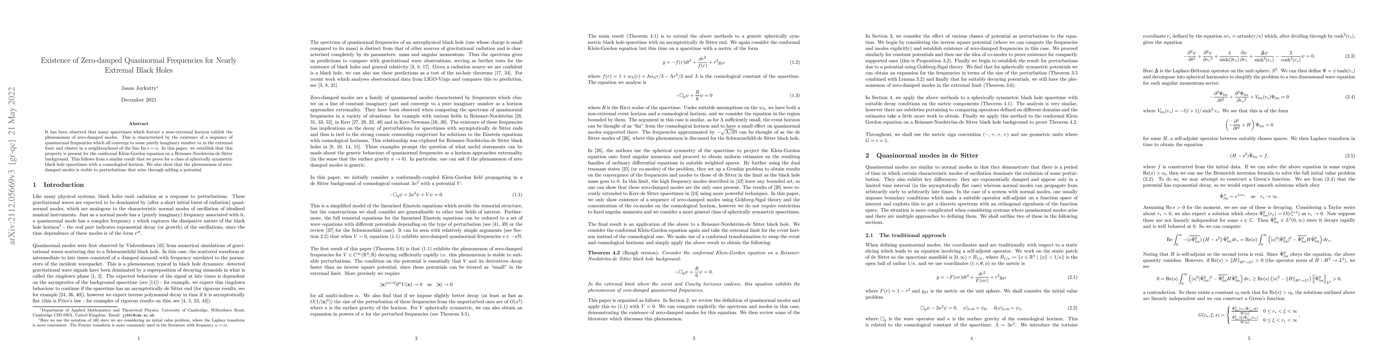 This research establishes the existence of zero-damped quasinormal frequencies for nearly extremal black holes, characterized by purely imaginary convergence in the extremal limit. It demonstrates this property for the conformal Klein-Gordon equation in Reissner-Nordström-de Sitter spacetime and shows stability against perturbations involving added potentials.