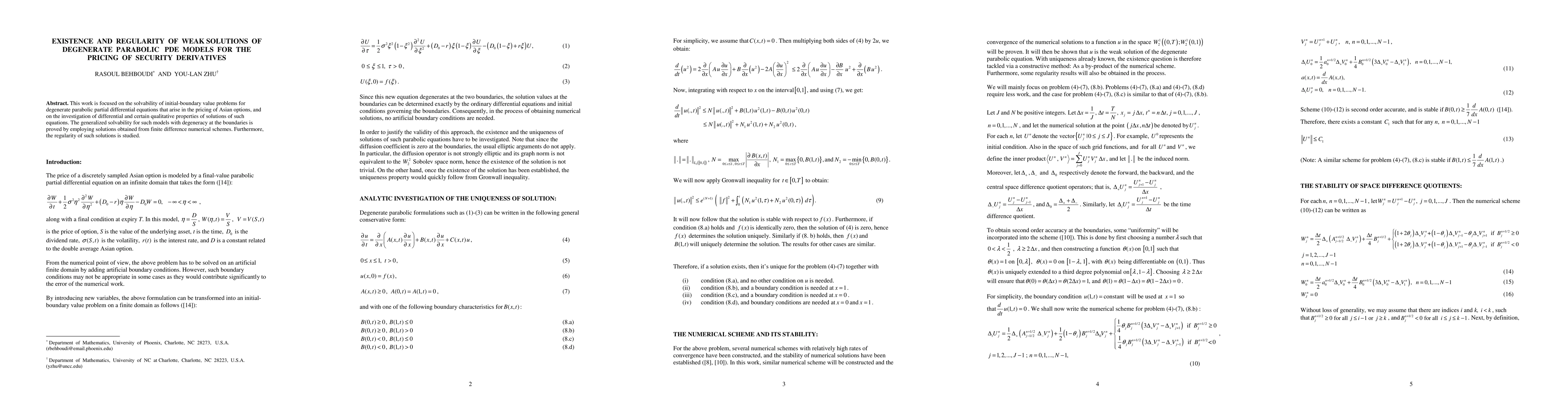 This paper investigates the existence and regularity of weak solutions for degenerate parabolic PDEs in security derivative pricing, particularly Asian options, using finite difference schemes to prove generalized solvability and examining the qualitative properties of these solutions.
