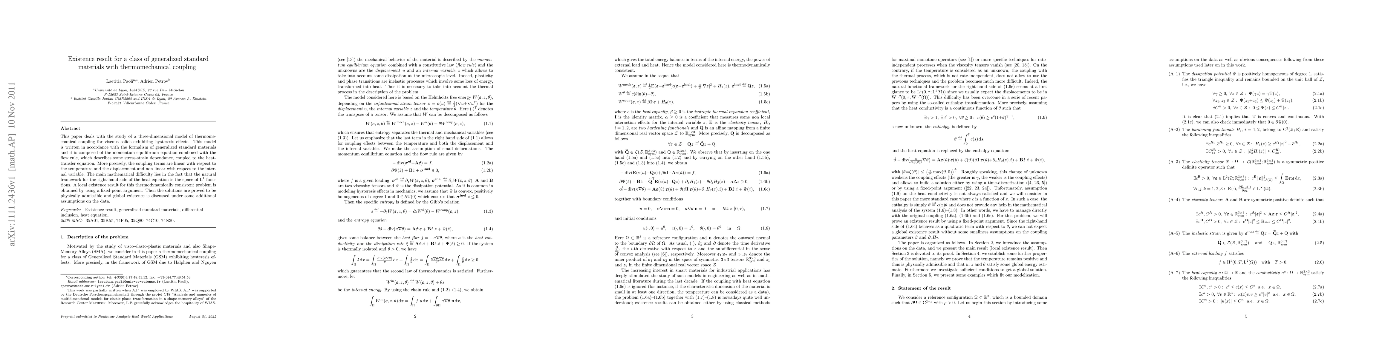 A research paper establishes a local existence result for a three-dimensional model of thermomechanical coupling in materials with hysteresis effects, using a fixed-point argument to prove physically admissible solutions under certain assumptions.
