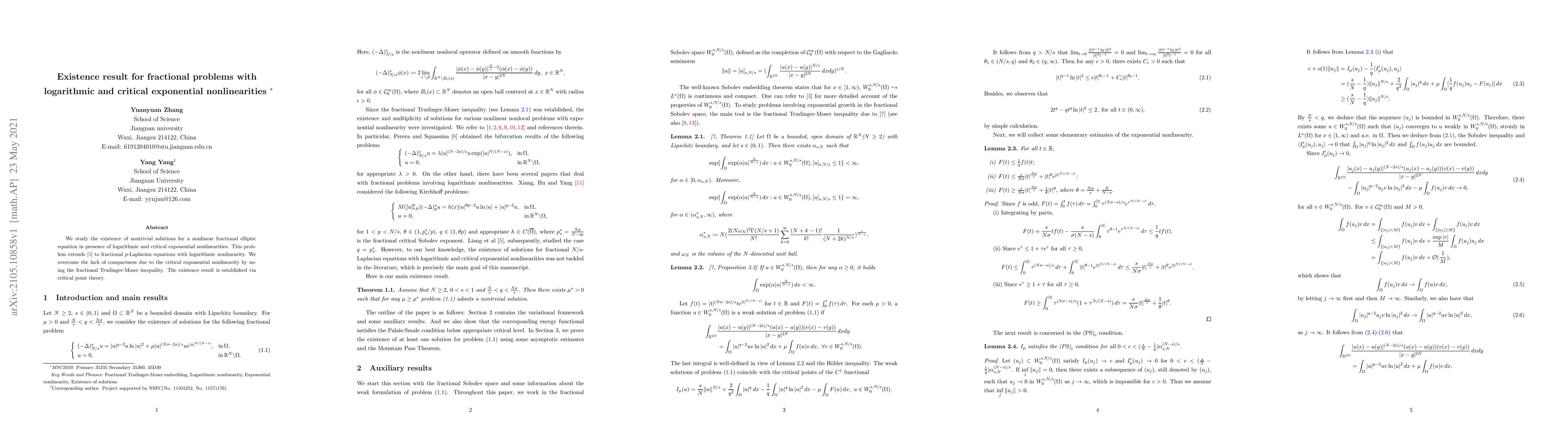 This paper investigates the existence of nontrivial solutions for fractional elliptic equations featuring logarithmic and critical exponential nonlinearities, extending previous work to fractional $N/s$-Laplacians. The authors address the lack of compactness caused by the critical exponential nonlinearity using the fractional Trudinger-Moser inequality and establish the result through critical point theory.