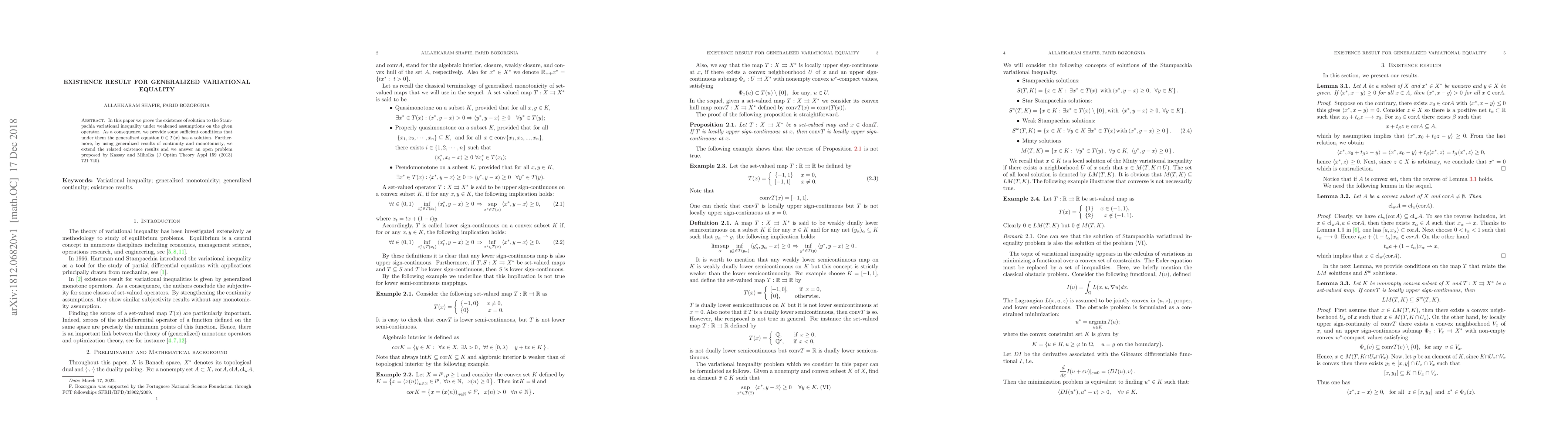 This paper proves the existence of a solution to the Stampachia variational inequality under weakened assumptions on the given operator. It also provides sufficient conditions for the generalized equation 0 in T(x) to have a solution.