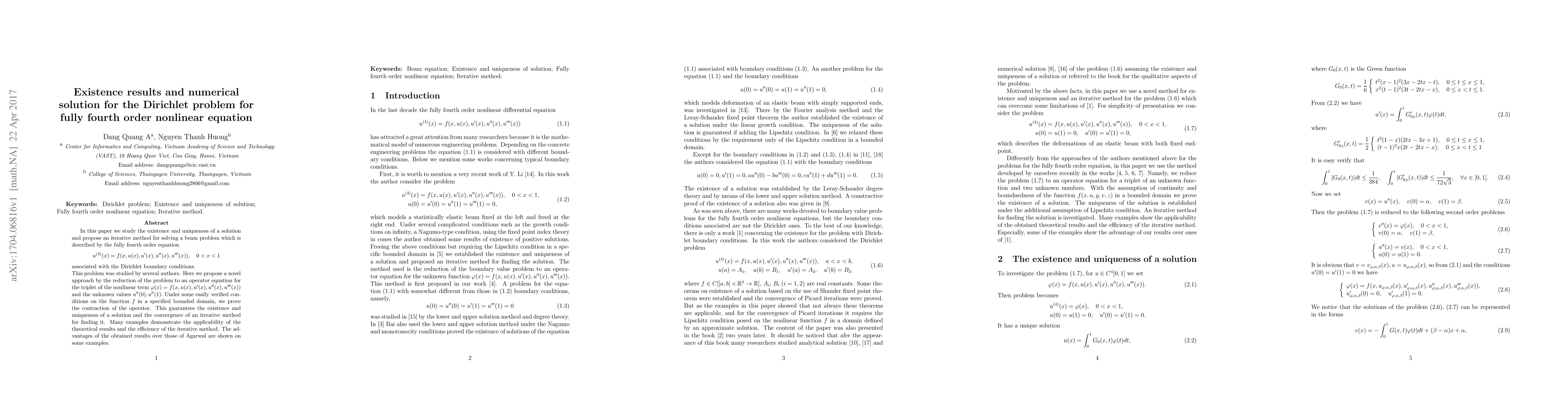 This paper establishes the existence and uniqueness of solutions for a fully fourth-order nonlinear equation describing a beam problem, proposing an iterative method for its numerical solution. The method's efficiency is demonstrated through examples, showing advantages over previous results.