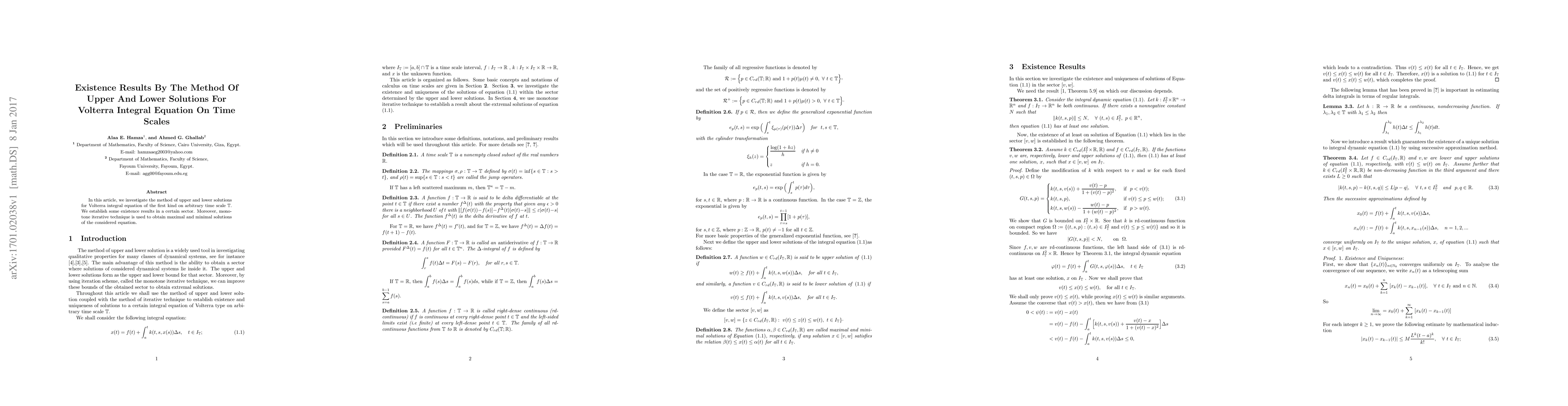 In this article, we investigate the method of upper and lower solutions for Volterra integral equation of the first kind on arbitrary time scale $\mathbb{T}$. We establish some existence results in a certain sector. Moreover, monotone iterative technique is used to obtain maximal and minimal solutions of the considered equation.