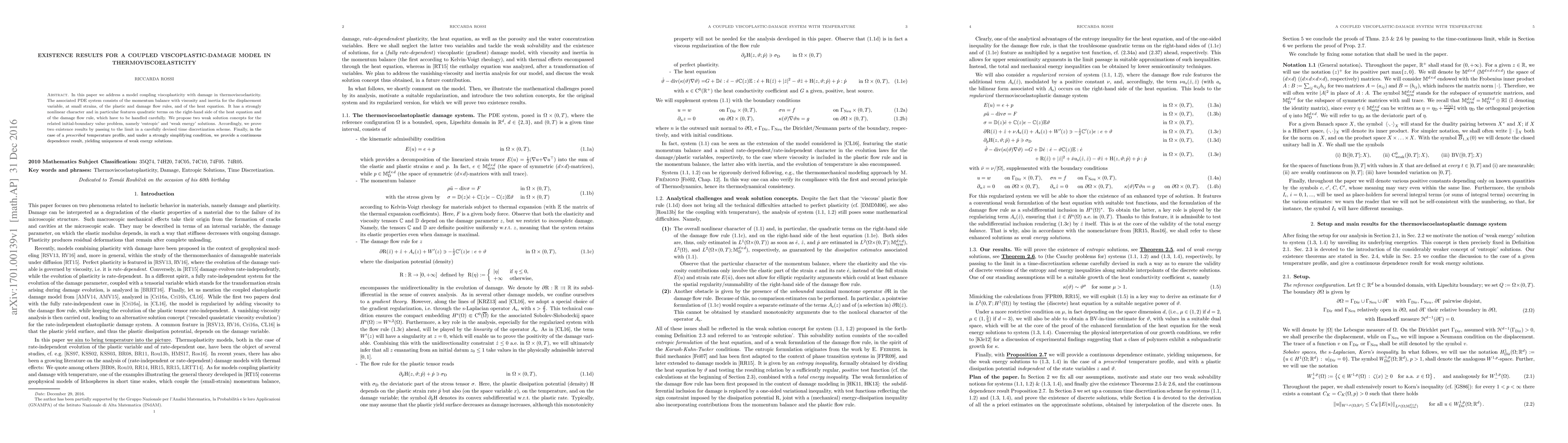 This paper proves existence results for a coupled viscoplastic-damage model in thermoviscoelasticity, proposing two weak solution concepts and showing that they lead to unique solutions under certain conditions.