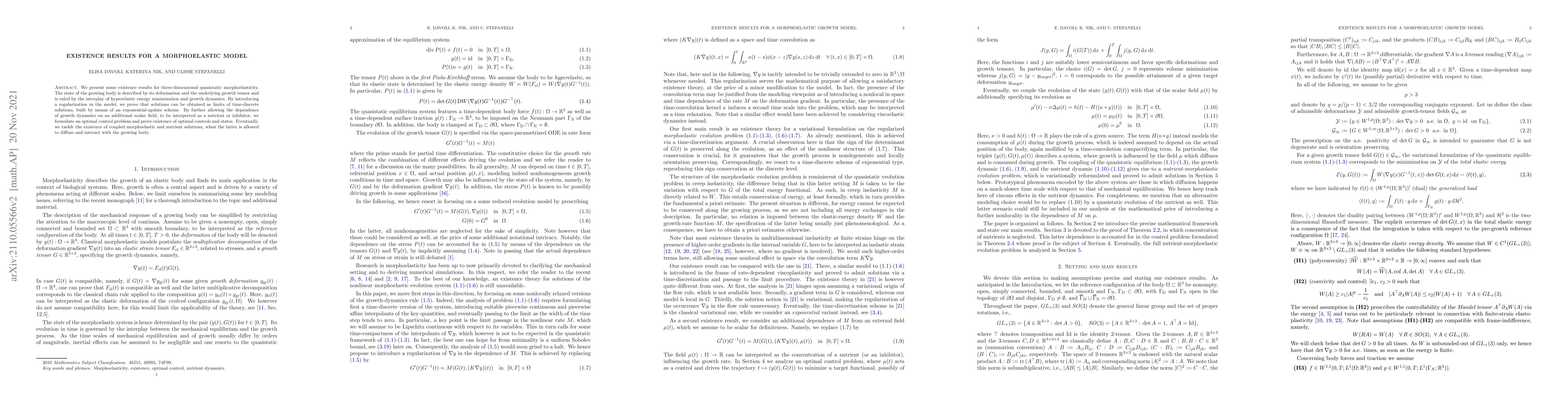 We present some existence results for three-dimensional quasistatic morphoelasticity. The state of the growing body is described by its deformation and the underlying growth tensor and is ruled by the interplay of hyperelastic energy minimization and growth dynamics. By introducing a regularization in the model, we prove that solutions can be obtained as limits of time-discrete solutions, built by means of an exponential-update scheme. By further allowing the dependence of growth dynamics on an additional scalar field, to be interpreted as a nutrient or inhibitor, we formulate an optimal control problem and prove existence of optimal controls and states. Eventually, we tackle the existence of coupled morphoelastic and nutrient solutions, when the latter is allowed to diffuse and interact with the growing body.