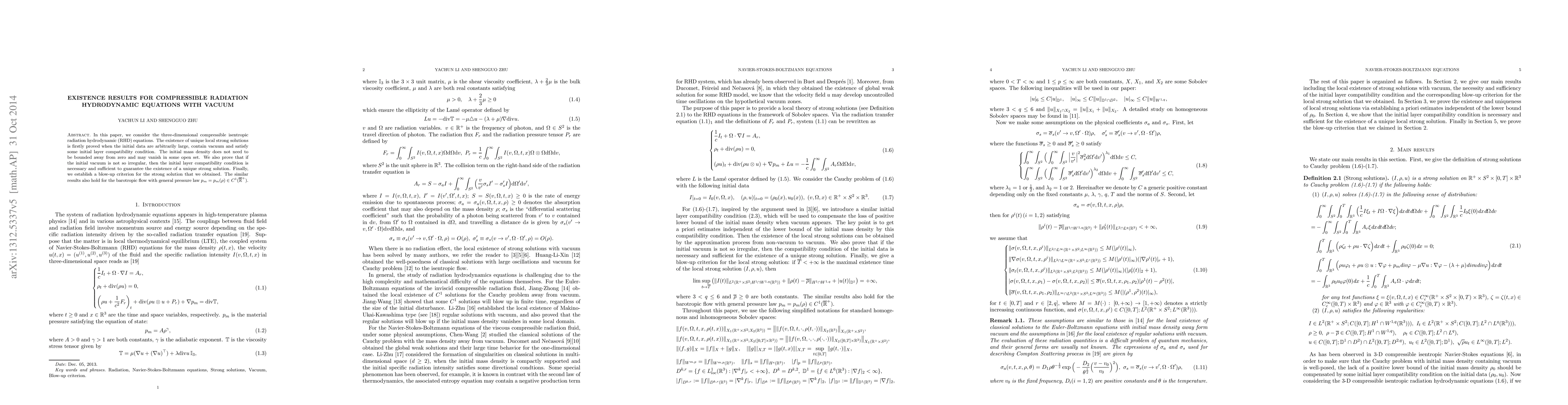 In this paper, we consider the 3-D compressible isentropic radiation hydrodynamics (RHD) equations. The local existence of strong solutions with vacuum is firstly established when the initial data is arbitrarily large, contains vacuum and satisfy some initial layer compatibility condition. The initial mass density needs not be bounded away from zero, it may vanish in some open set or decay at infinity. We also prove that if the initial vacuum is not so irregular, then the compatibility condition of the initial data is necessary and sufficient to guarantee the existence of a unique strong solution. Finally, we prove a blow-up criterion for the local strong solution. The similar result also holds for the general barotropic flow with pressure law $p_m=p_m(\rho)\in C^1(\mathbb{\overline{R}}^+)$.