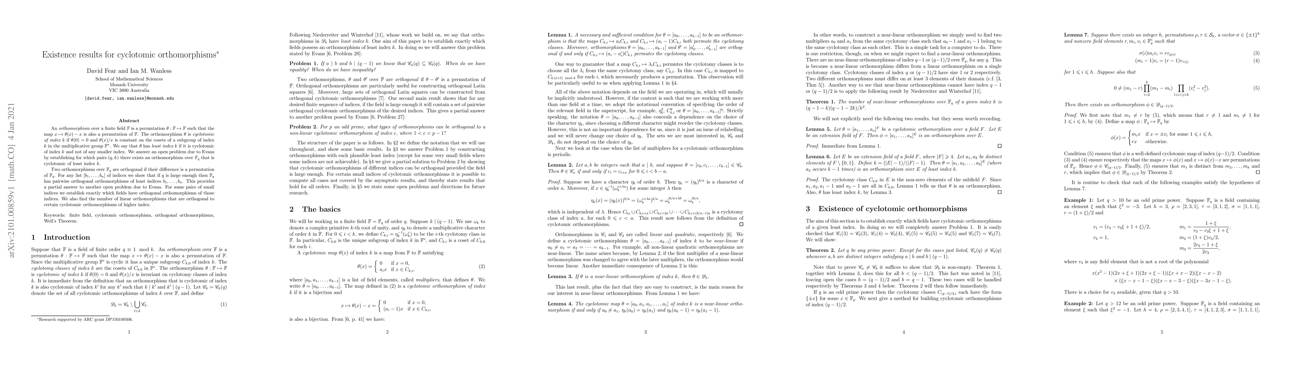 An {\em orthomorphism} over a finite field $\mathbb{F}$ is a permutation $\theta:\mathbb{F}\mapsto\mathbb{F}$ such that the map $x\mapsto\theta(x)-x$ is also a permutation of $\mathbb{F}$. The orthomorphism $\theta$ is {\em cyclotomic of index $k$} if $\theta(0)=0$ and $\theta(x)/x$ is constant on the cosets of a subgroup of index $k$ in the multiplicative group $\mathbb{F}^*$. We say that $\theta$ has {\em least index} $k$ if it is cyclotomic of index $k$ and not of any smaller index. We answer an open problem due to Evans by establishing for which pairs $(q,k)$ there exists an orthomorphism over $\mathbb{F}_q$ that is cyclotomic of least index $k$. Two orthomorphisms over $\mathbb{F}_q$ are orthogonal if their difference is a permutation of $\mathbb{F}_q$. For any list $[b_1,\dots,b_n]$ of indices we show that if $q$ is large enough then $\mathbb{F}_q$ has pairwise orthogonal orthomorphisms of least indices $b_1,\dots,b_n$. This provides a partial answer to another open problem due to Evans. For some pairs of small indices we establish exactly which fields have orthogonal orthomorphisms of those indices. We also find the number of linear orthomorphisms that are orthogonal to certain cyclotomic orthomorphisms of higher index.