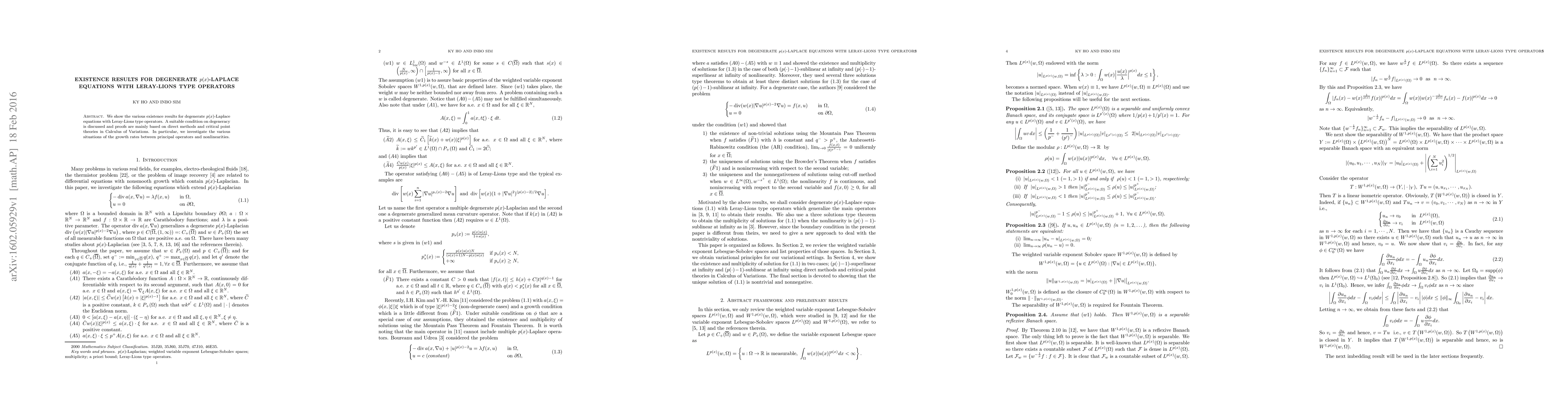 This research paper proves existence results for degenerate $p(x)$-Laplace equations with Leray-Lions type operators under specific conditions, using direct methods and critical point theories from Calculus of Variations.