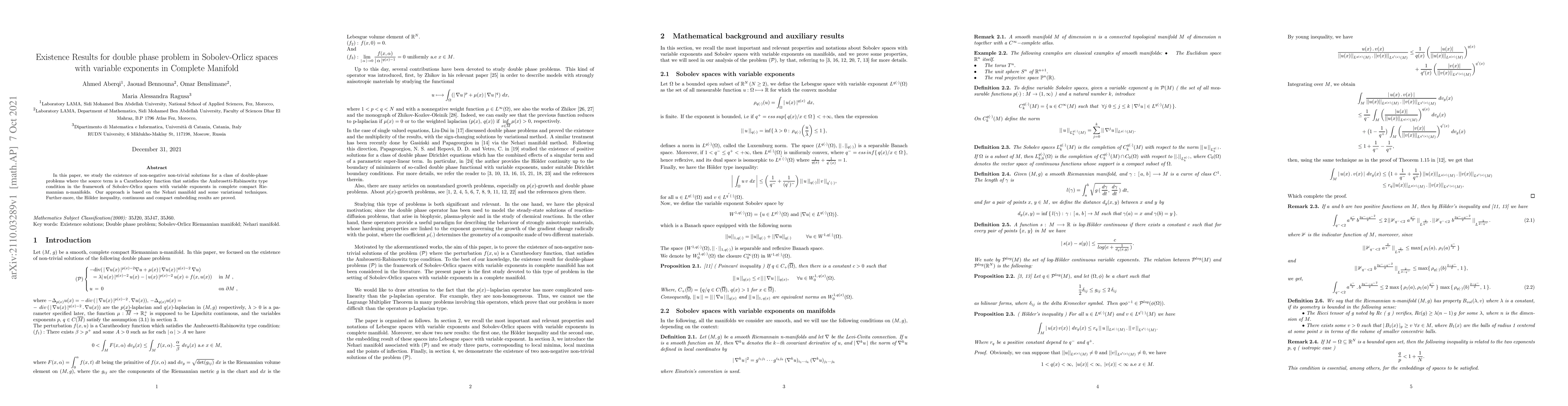 In this paper, we study the existence of non-negative non-trivial solutions for a class of double-phase problems where the source term is a Caratheodory function that satisfies the Ambrosetti-Rabinowitz type condition in the framework of Sobolev-Orlicz spaces with variable exponents in complete compact Riemannian n-manifolds. Our approach is based on the Nehari manifold and some variational techniques. Furthermore, the H\"older inequality, continuous and compact embedding results are proved.