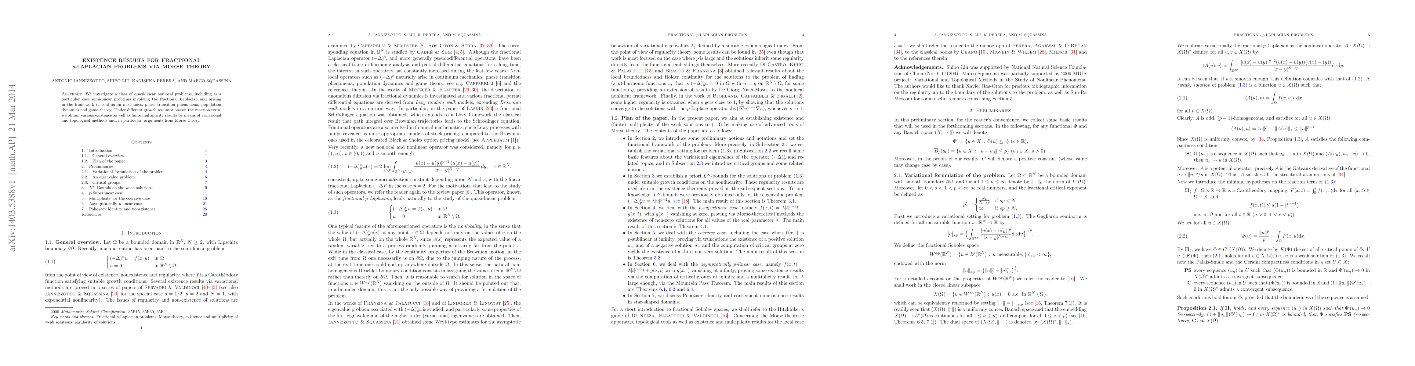 This research paper uses Morse theory to prove existence results for a class of fractional p-Laplacian problems in various fields like continuum mechanics and population dynamics, providing finite multiplicity solutions under different growth assumptions.