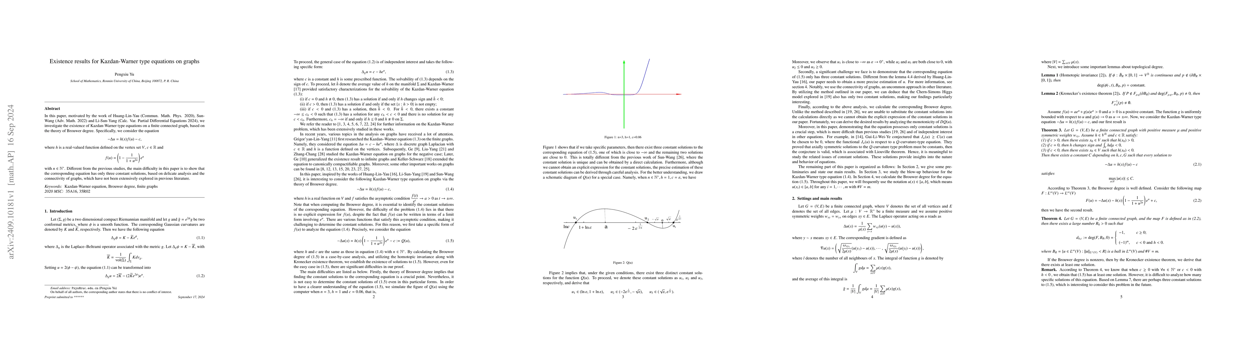 This paper explores the existence of solutions for Kazdan-Warner type equations on finite connected graphs using Brouwer degree theory. It demonstrates that the equation has only three constant solutions, addressing a novel challenge in graph connectivity analysis.