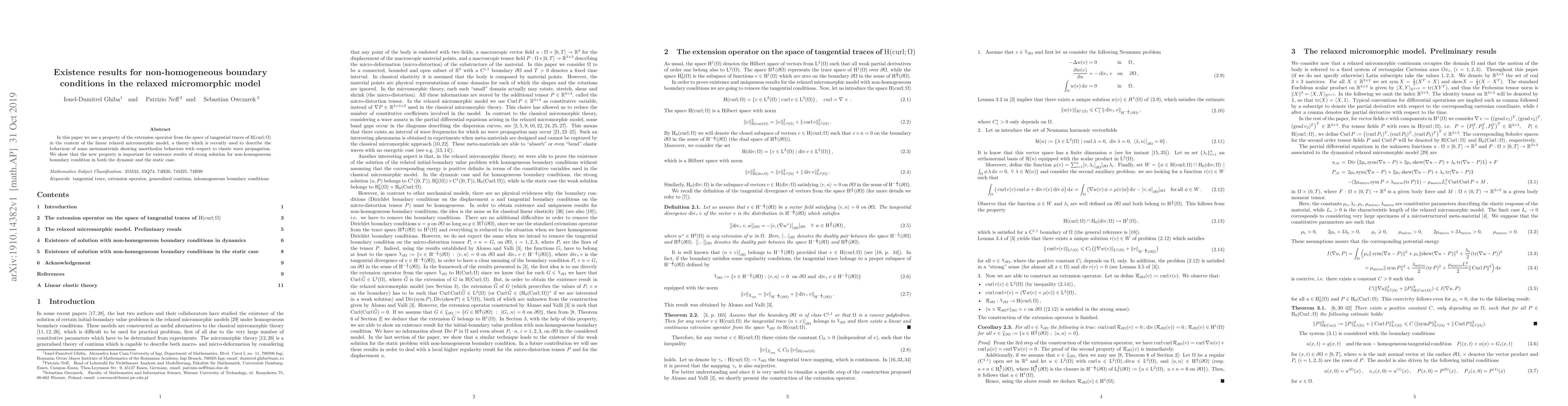 In this paper we use a property of the extension operator from the space of tangential traces of ${\rm H}({\rm curl};\Omega)$ in the context of the linear relaxed micromorphic model, a theory which is recently used to describe the behaviour of some metamaterials showing unorthodox behaviors with respect to elastic wave propagation. We show that the new property is important for existence results of strong solution for non-homogeneous boundary condition in both the dynamic and the static case.